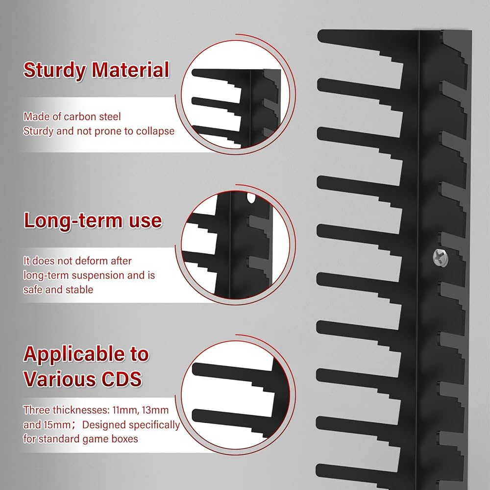 【Heavy-Gauge Steel Construction for Maximum Durability】Crafted from premium thickened carbon steel with a rust-resistant powder-coated finish, this video game storage wall rack is built to withstand heavy use without bending, sagging, or warping. Each rack offers rock-solid support, ensuring long-term protection for your growing game collection.