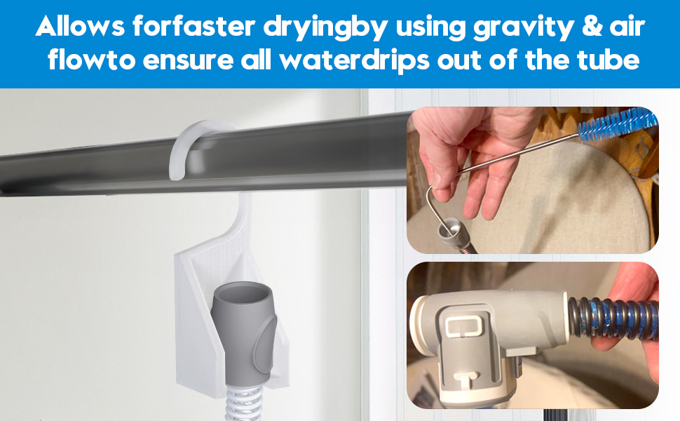 The CPAP hose brush cleaning kit comes with a wall-mounted hook, providing a practical solution for storage and drying. You can easily hang the cleaned hose and mask beside your bed, keeping them off the ground, maintaining cleanliness and ventilation, effectively reducing clutter, and creating a tidy and organized sleeping space