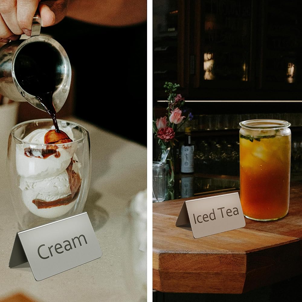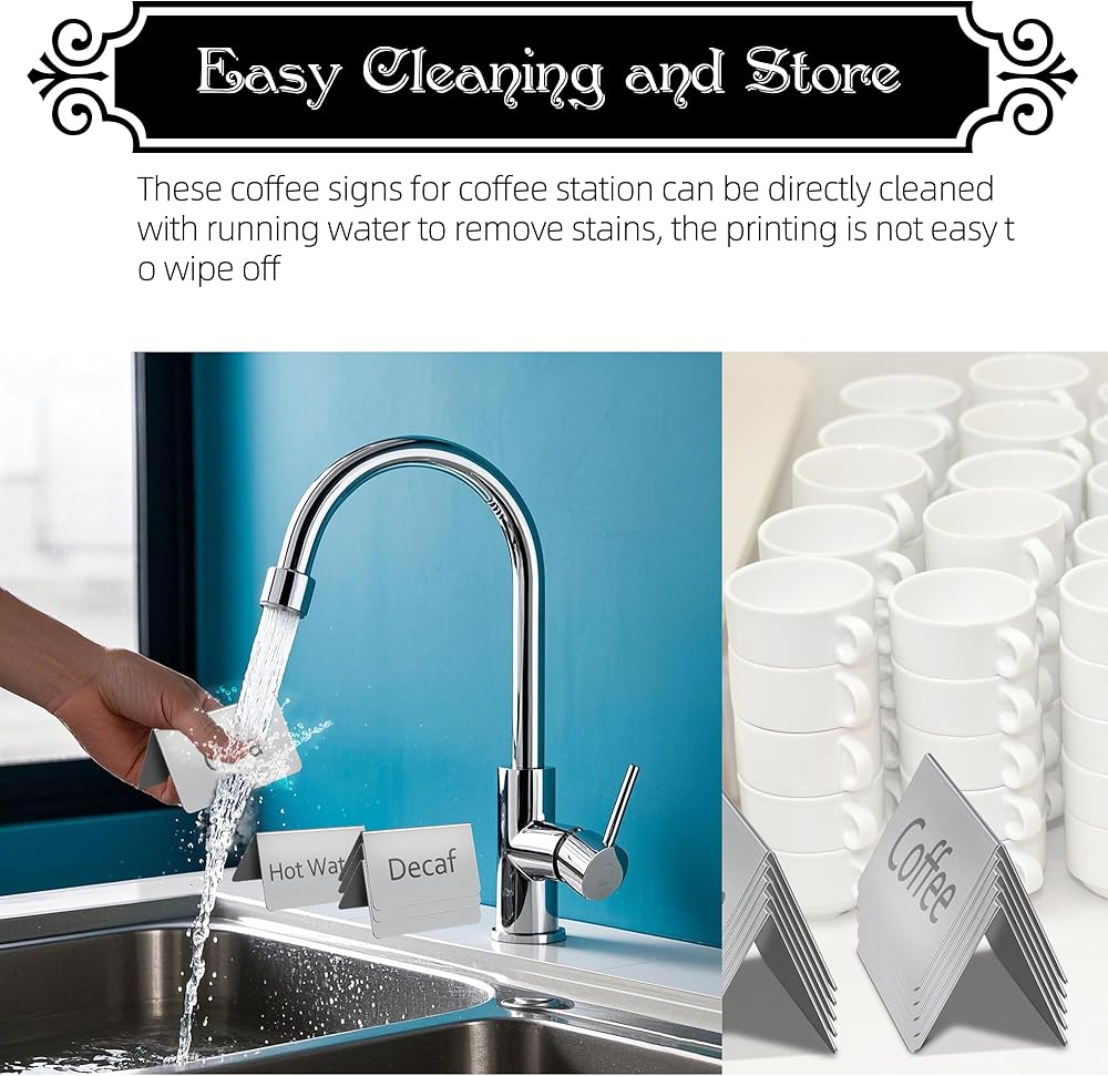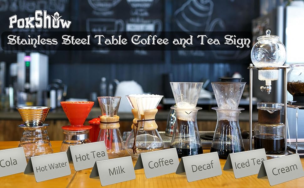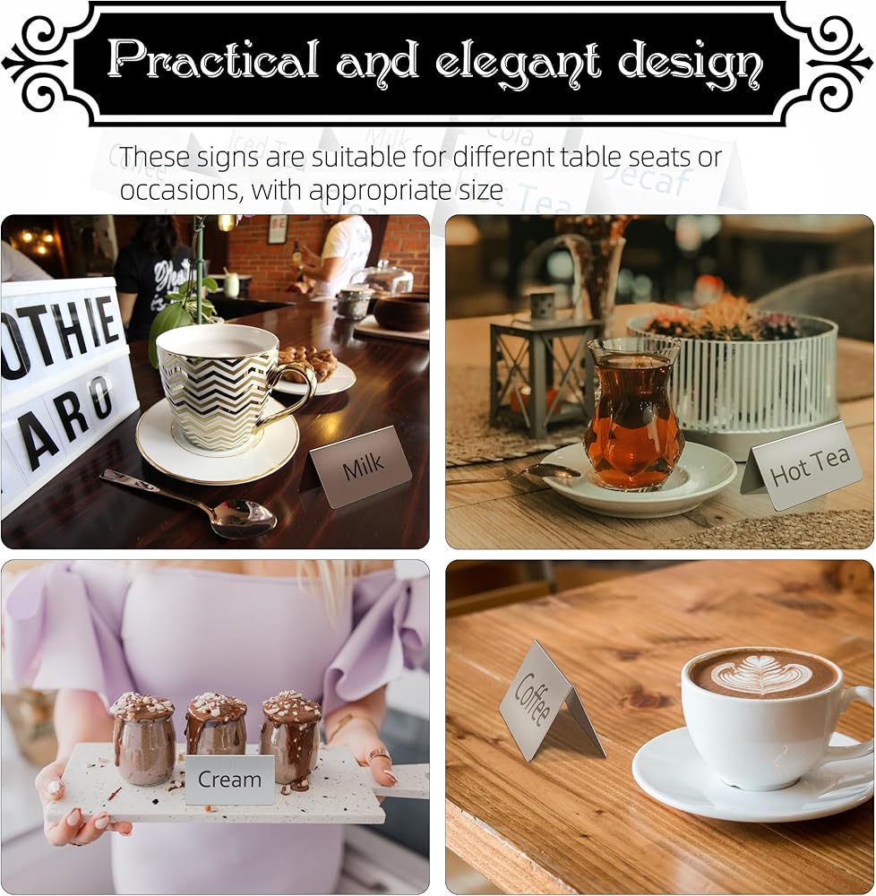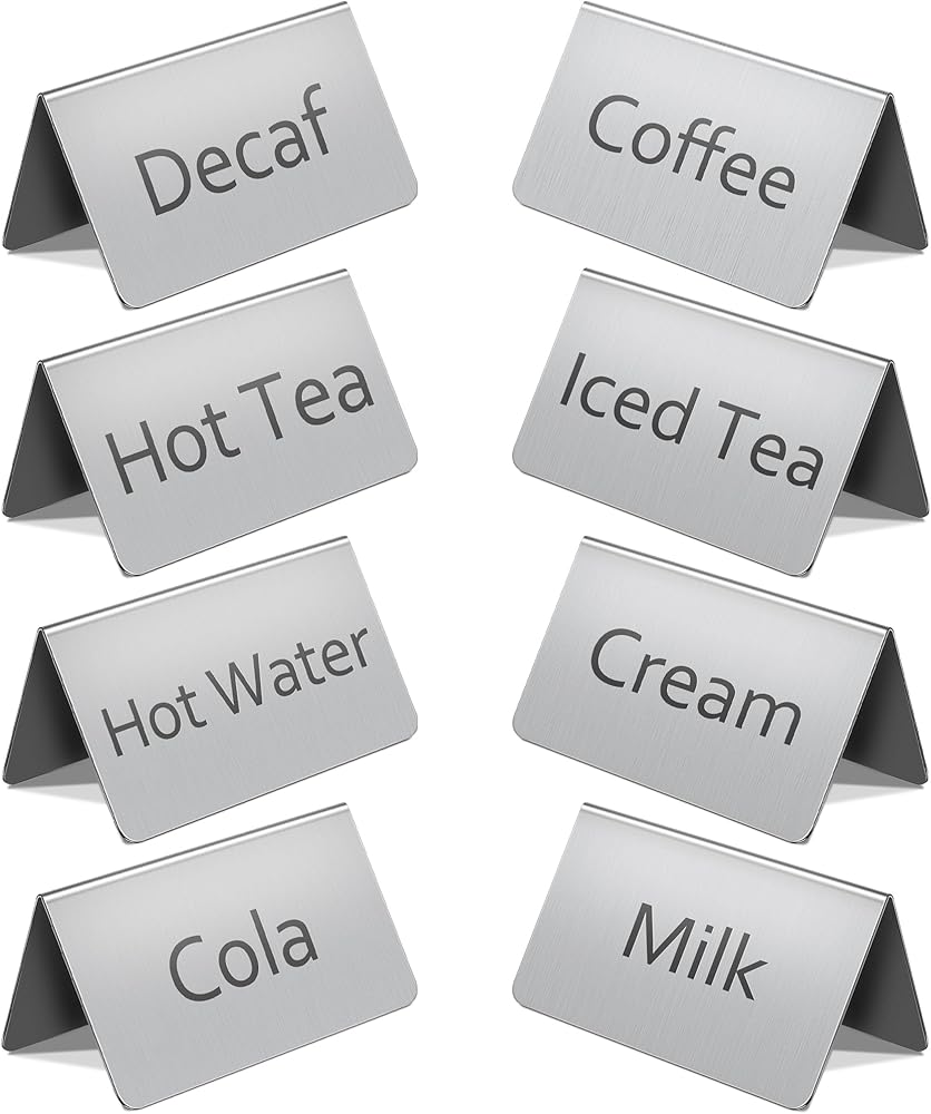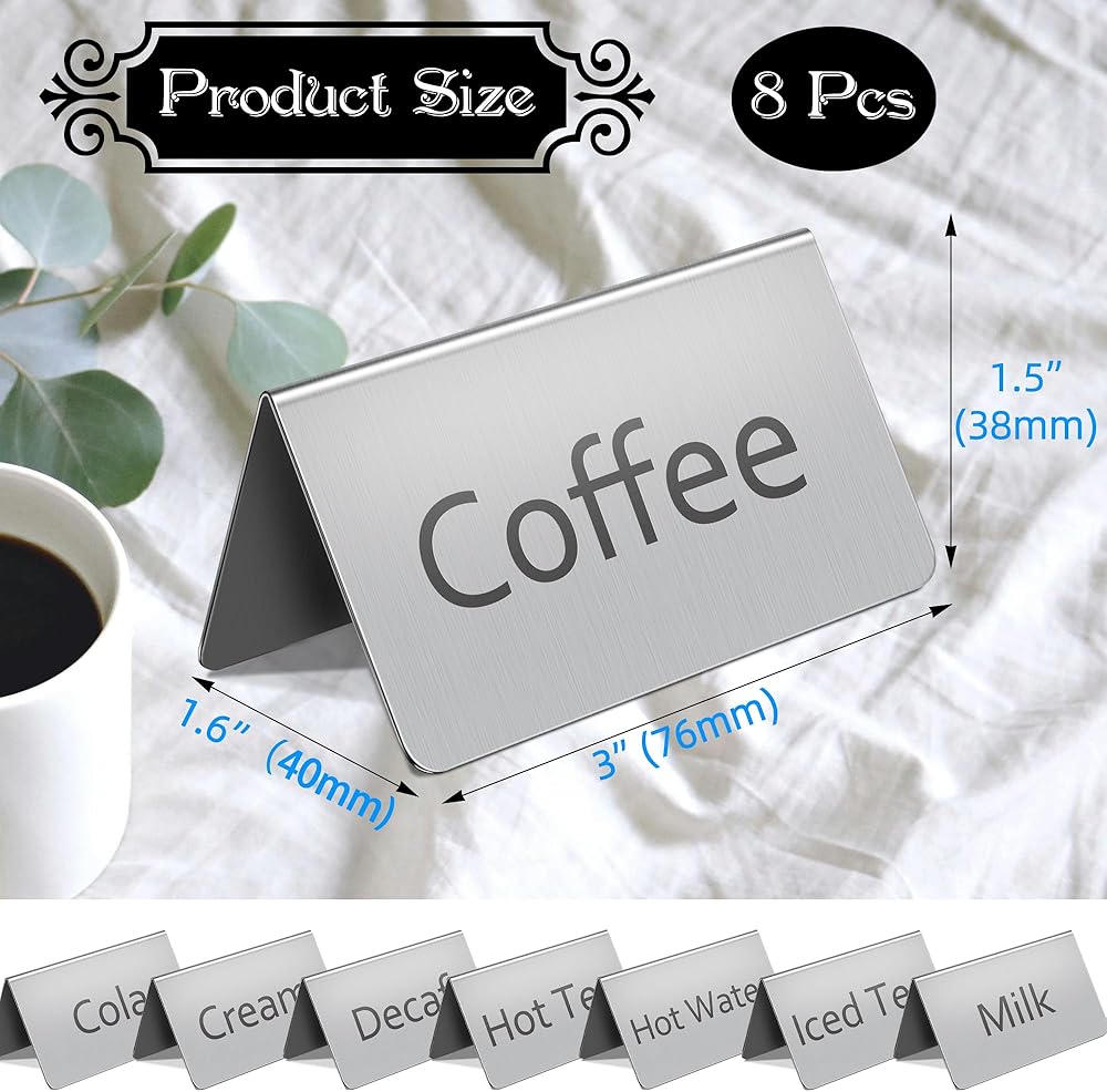 【Package Includes】 you will receive 8 pcs stainless steel elegant tent signs printed with words including coffee, decaf, hot water, hot tea, iced tea, cream, milk,cola; The size is about 2.99 x 1.5 inches/ 7.6 x 3.8 cm