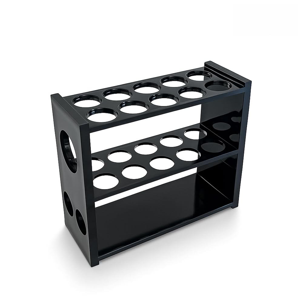 Dual-Sided Design – Features two functional sides: one with 10 holes (15 mm) for holding 10 ml conical tubes or smaller glass tubes, and the other with a hole (22 mm) for holding up to 25 ml glass test tubes or wider vials.