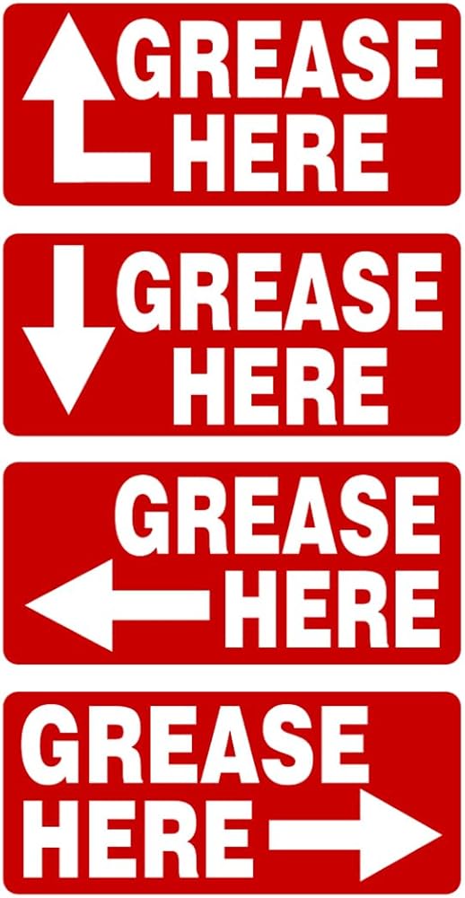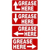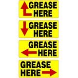 Enhance your machinery maintenance routine with our premium Grease Here Arrow Labels, designed specifically for clear and effective lubrication point identification. These rectangle stickers feature bold "GREASE HERE" text combined with directional arrows pointing up, down, left, or right, making them ideal for maintenance, repair, and operations (MRO) tasks on powered machinery, industrial equipment, heavy-duty vehicles, and manufacturing tools. Each pack includes 20 durable labels—5 of each arrow direction—ensuring versatile application for various grease fitting locations and lube point marking. Crafted for longevity in demanding environments, these lubrication stickers are printed on high-tack adhesive material that sticks securely to metal, plastic, and other surfaces, resisting oil, grease, dirt, and harsh weather conditions. The added gloss laminate overlay provides extra protection against fading, scratching, and UV damage, guaranteeing your grease point labels remain legible and professional-looking over time. Perfect for mechanics, technicians, fleet managers, and industrial operators seeking reliable equipment maintenance decals to prevent downtime and ensure proper lubrication schedules.Whether you're labeling grease zerks, oil ports, or other lube points on tractors, forklifts, CNC machines, or HVAC systems, our Grease Here Arrow Stickers deliver unmatched clarity and reliability. Available in multiple sizes and colors to match your specific needs—check variations for options. Order now to streamline your machinery lubrication process and keep your operations running smoothly!