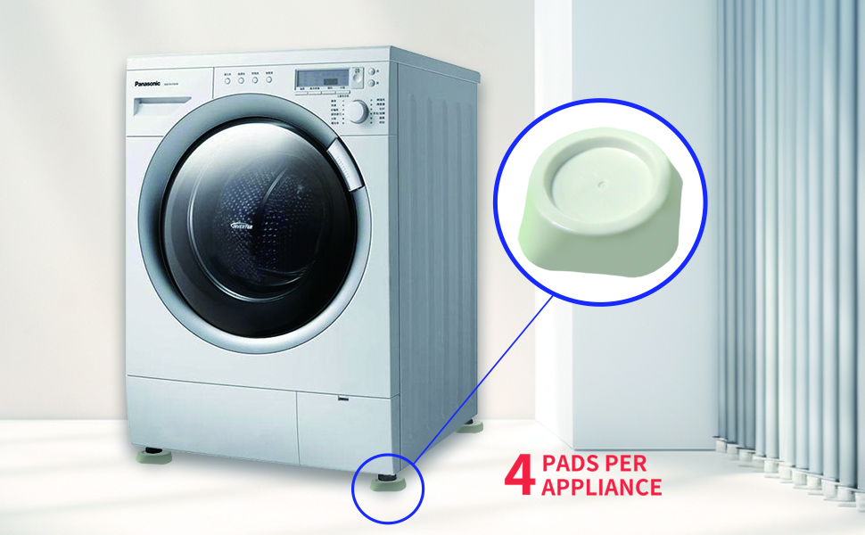 Fits even XL washer feet up to 2.2" diameter; ideal for all brands and setups: simply lift each corner of the machine and slide the noise absorbing pads into place; Order 2 sets to keep your side-by-side washer/dryer both level