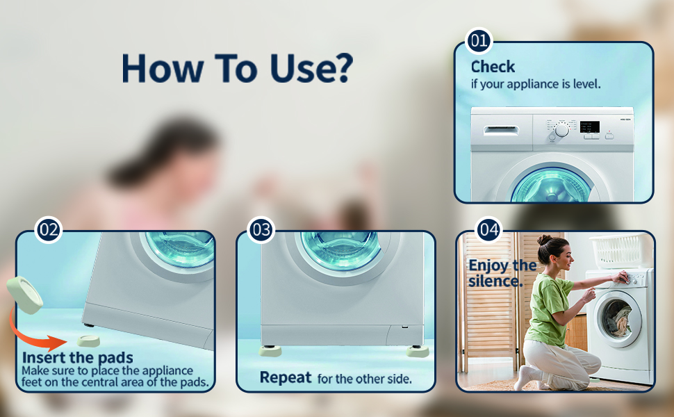 Our premium rubber pads absorb washer shocks and vibrations, reducing noise and shaking floors and walls; Protects floors from scuffs and your appliance from impact damage.
