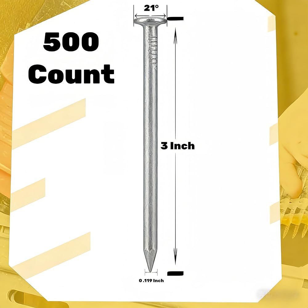 【Package Information】: 500 counts framing nails provide you with a sufficient supply for multiple projects, with a length of approximately 3 inches and a diameter of 0..119 inches, 21 degree ring handle electric galvanized plastic with sheath nails, suitable for a wide range of applications, including construction and woodworking