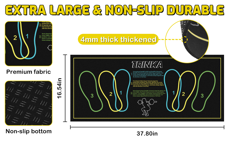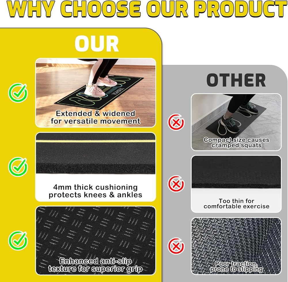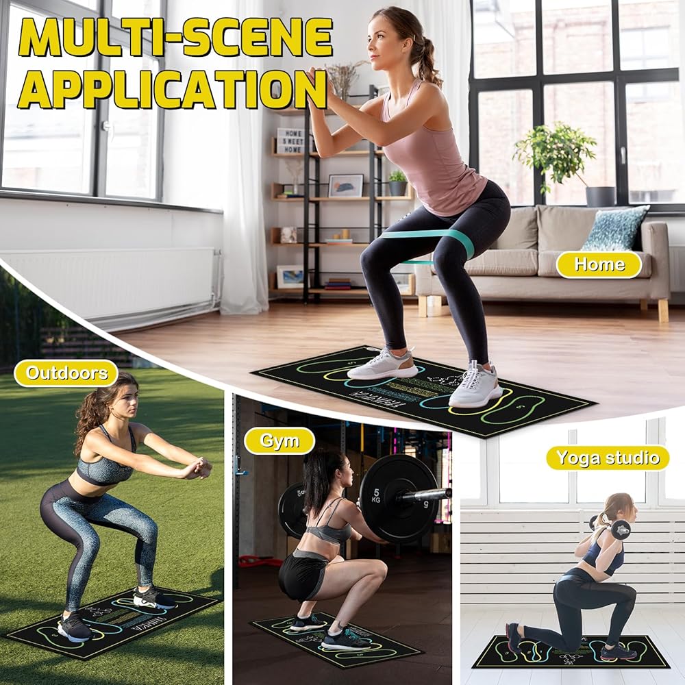 【Precise Foot Positioning】This squat mat with foot position features clear and accurate foot placement markers and professional movement guidelines, helping you achieve proper squat form every time. As a reliable training aid, this squat foot placement mat eliminates guesswork about foot width distance or angles, maximizing training efficiency.