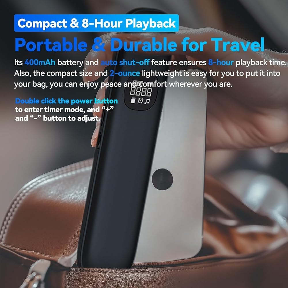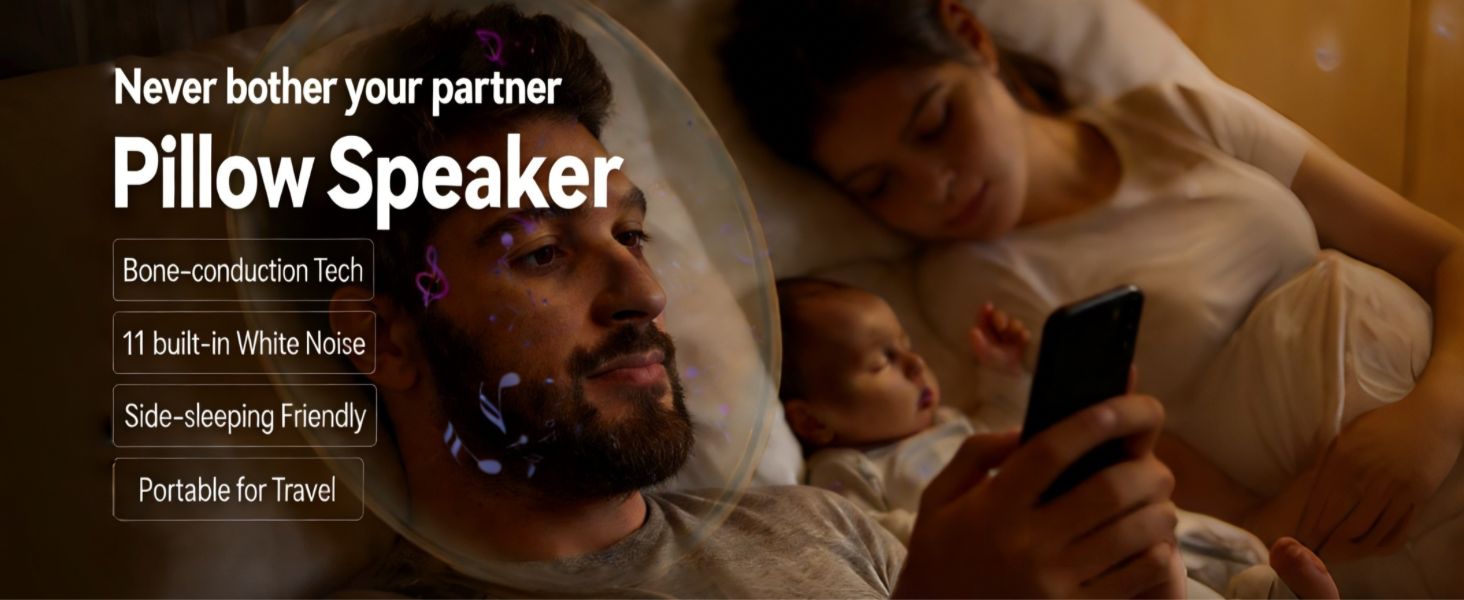 🌙【11 Built-in White Noises for Deeper Sleep 】Press a button to activate soothing sounds from this bluetooth pillow speaker for sleeping: rain, ocean waves, forest ambiance, and more. Ideal for sleep therapy, meditation, or drowning out noise. Unlike basic pillow speakers for sleeping, our bone conduction sleep speaker includes a full library of calming audio to help you fall asleep faster.