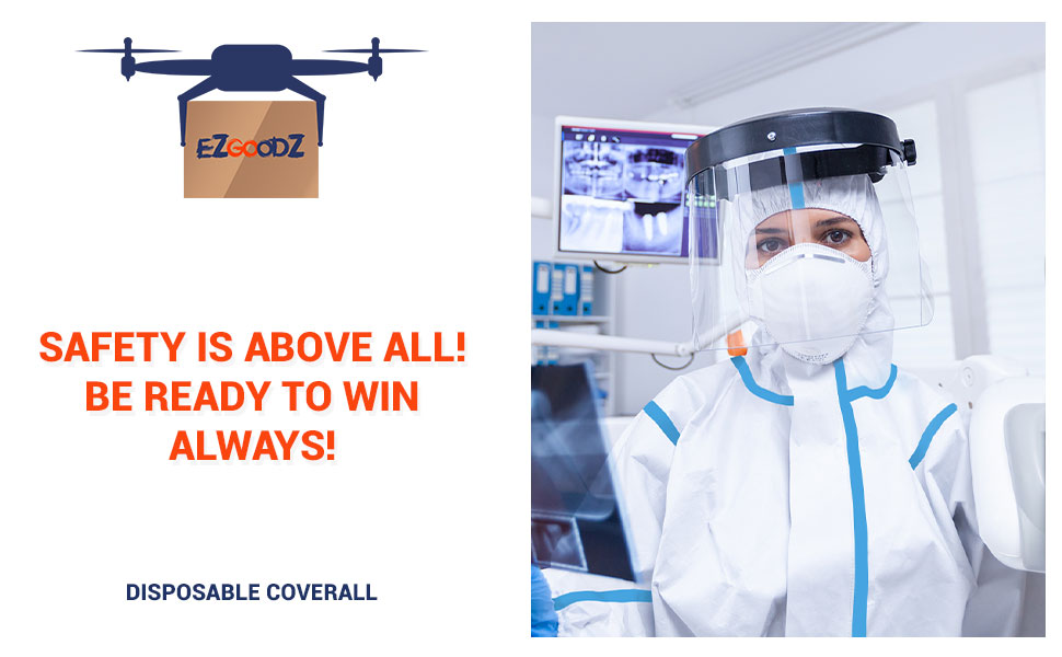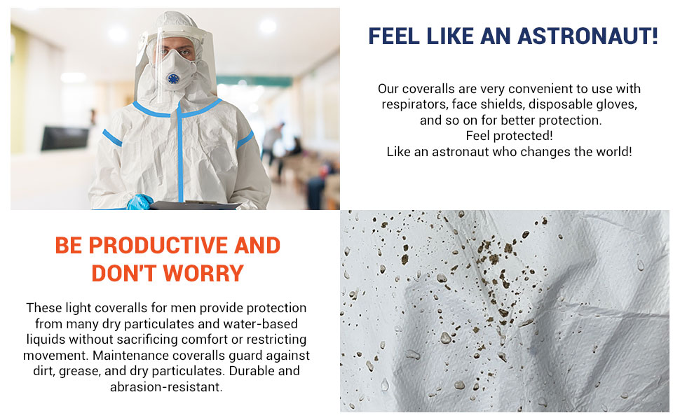 SAFE & SECURE. Wearing disposable coveralls for men means you won't need any additional protective equipment tools. Full hazmat suit will cover body from top of head to tips of your legs. Also, strong zipper and elastic bands will help reliably secure chemical suit and do active physical movements.