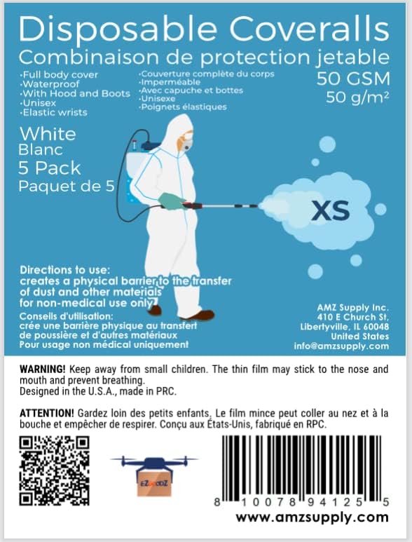 PACK OF 5 LAB COVERALLS X-SMALL. Disposable hazmat suit will become your perfect protective equipment on premises with high protection requirements. Full body cover suit is white and features a front zipper, elastic wrist, boots, and hood, which is attached to hazard suits.