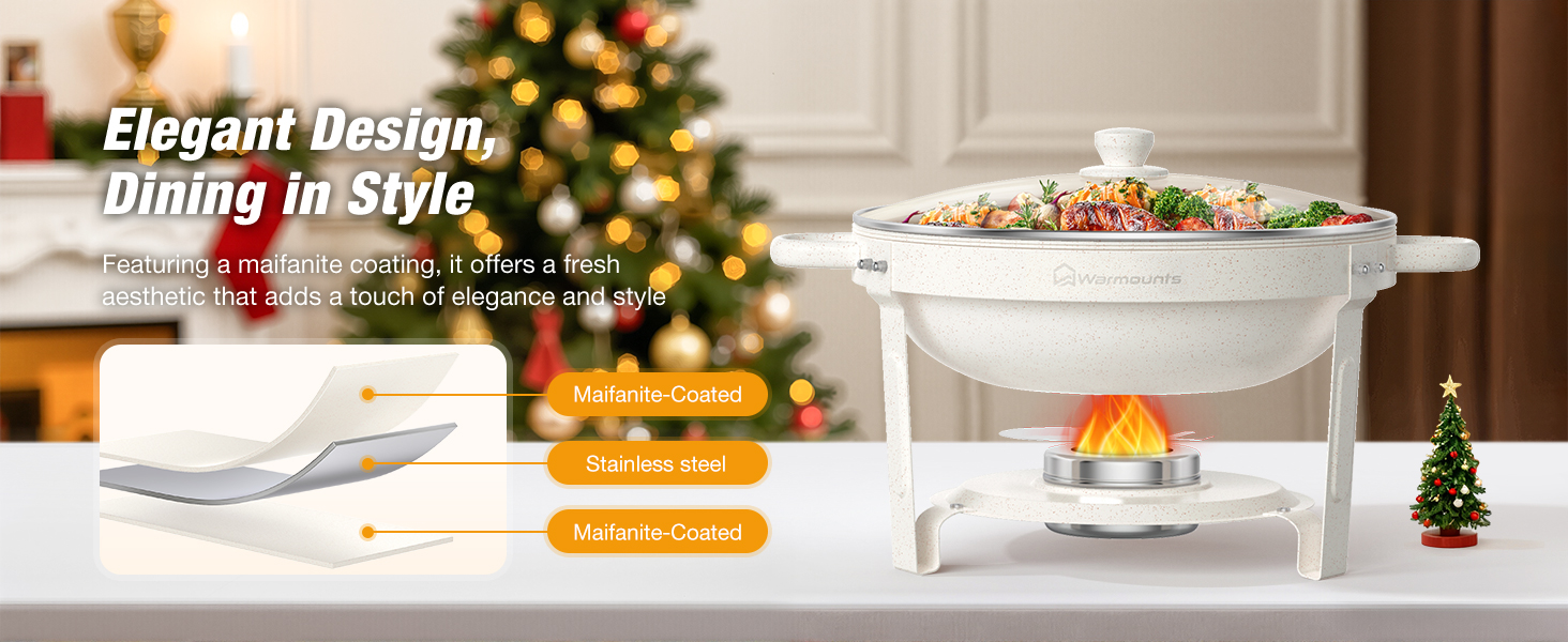 ELEGANT MAIFANITE DESIGN - With a sleek white maifanite-coated exterior, these round chafing dishes for buffet with clear lid elevate food presentation at weddings, parties, and catered events. The scratch-resistant surface keeps its refined look even after frequent use, giving every occasion a clean, modern style