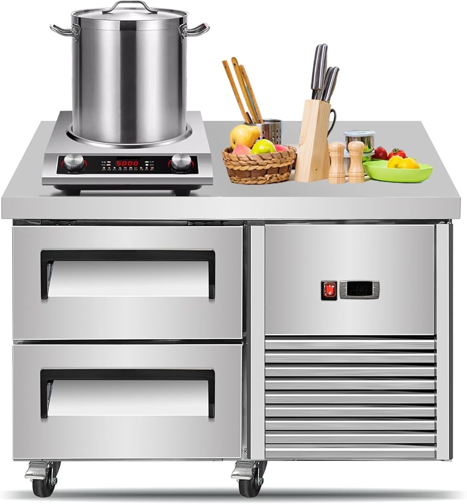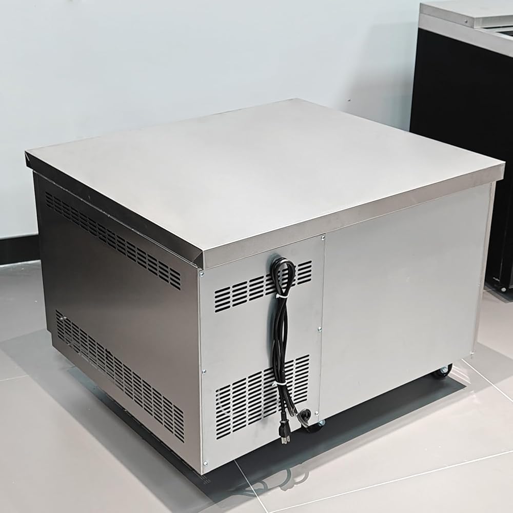 [ Features in Detail ] Kolice commercial under counter storage cabinet refrigerated chef base, 110V 60HZ, US plug, dimensions :36"L X 32"D X 25"H, capacity up to 29 cu.ft. equipped with 2 pull-out drawers with heavy duty stronger rack and rollers, make it easy to open and close, 4 caster wheels design make it movable and maintain easily, food grade stainless steel, digital adjustable temperature control, working temperature ranges from 33°F to 41°F(0°-10°), perfect for keeping ingredients fresh and ready to use.