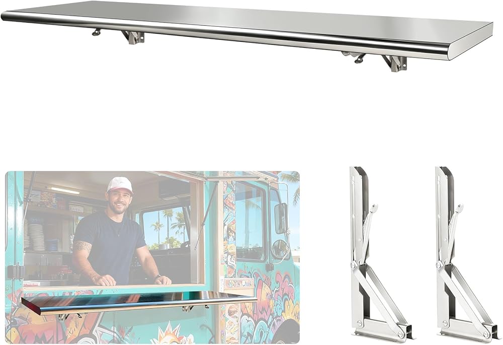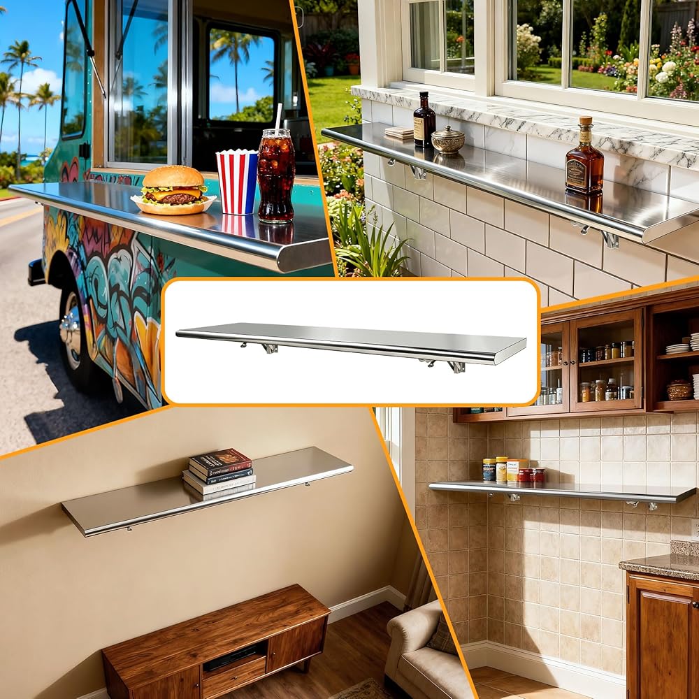 Wide Versatility for Commercial & Home Use:This fold-down serving shelf can be used as a concession window shelf, food truck serving station, kitchen storage rack, garage organizer, or bathroom utility shelf. It provides a convenient space-saving solution for both commercial and residential settings