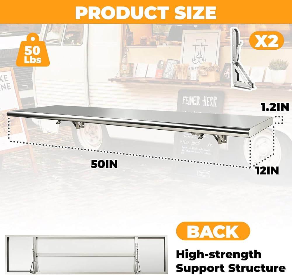 Product Dimensions:This folding concession shelf is designed in a practical 50"x12" dimension to fit most concession windows, food trucks and commercial kitchen spaces. We recommend measuring your installation area before purchase to help ensure a proper and secure setup