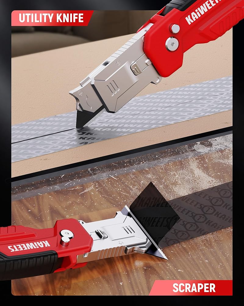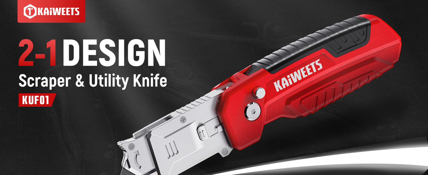 KAIWEETS Utility Knife Scraper, 2-in-1 Folding Box Cutter with Blade Storage, Heavy Duty Zinc Alloy Body, Retractable Design, 12pcs SK2 Black Blades replacement, EDC Tool for Home, Office, DIY– Red