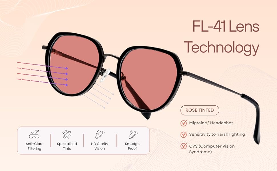 BRADDELL FL-41 Rose Tinted Migraine Light Sensitivity Glasses for Fluorescent LED Glare, Photophobia and Concussion