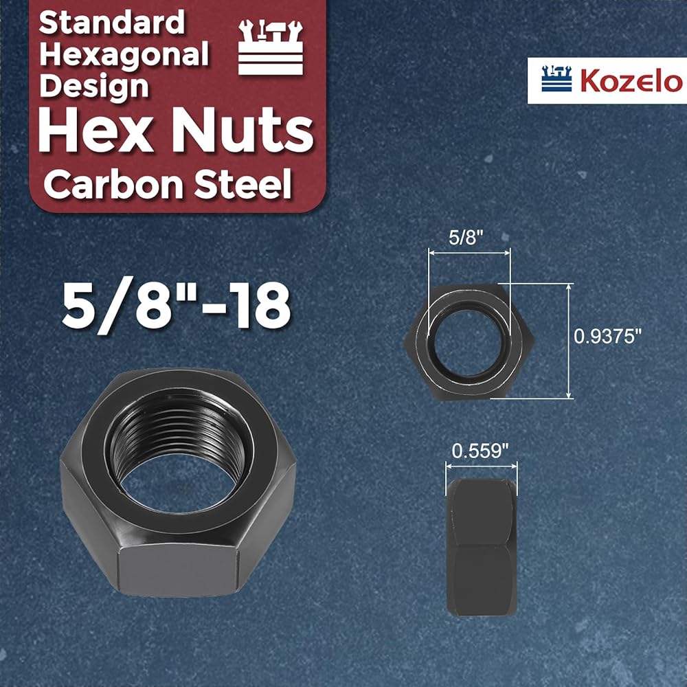 2pcs Hex Nuts - [5/8"-18] Carbon Steel Grade 8 Hardware Nuts for Mechanical Repair & Assembly, Standard Inch Fine Thread Nut, Black, ASME/ANSI B 18.2.2