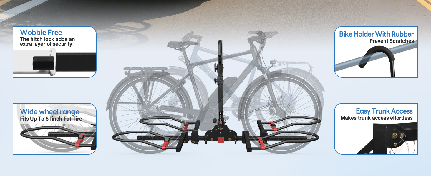Wide Compatibility: Designed for 2-inch receivers, this rack fits tires up to 5 inches wide and bikes with 17–29 inch wheels. Sliding wheel holders adjust to accommodate wheelbases up to 65 inches, offering flexibility for various bike styles