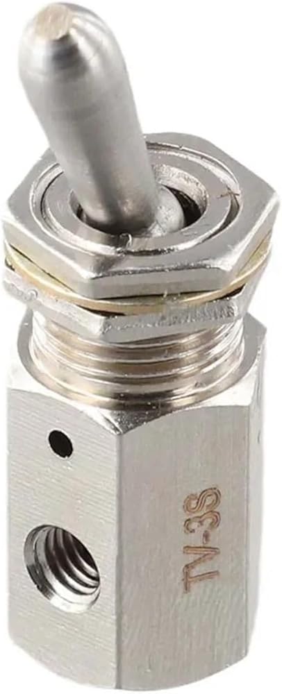 2-Position, 3-Way Functionality This TV-3S mechanical pneumatic valve features two positions (open/closed) and three ports (inlet, outlet, exhaust) for efficient airflow control in pneumatic systems.