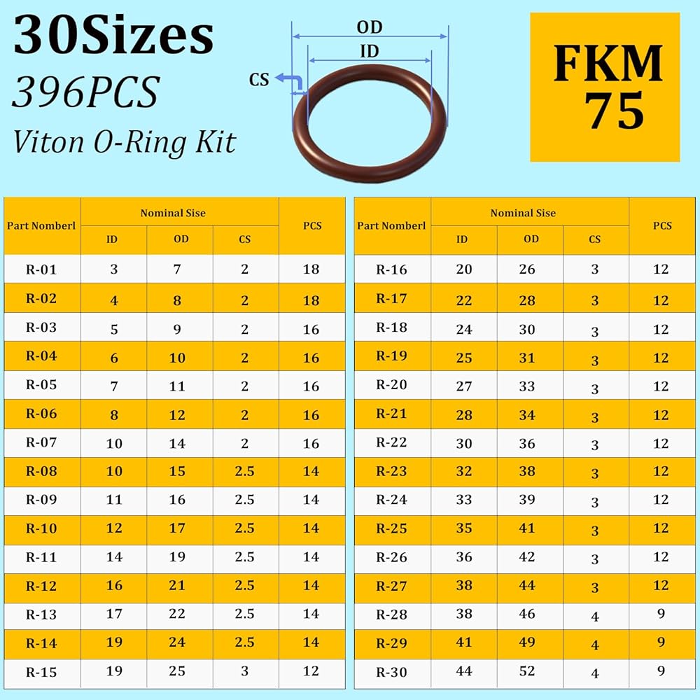 30 Size SAE FKM Viton O Ring Assortment Kit : Metric o ring assortment kit include 30 different sizes(ID rang form 3mm to 44mm,OD range 7mm to 52mm). It can meet almost all of your mechanical and home repair needs.