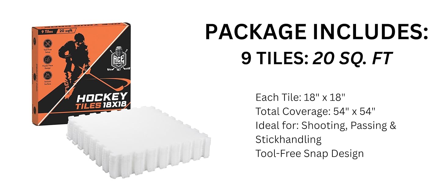 CUSTOMIZE YOUR TRAINING AREA: Our Ace Hockey 9-pack of 18"x18" tiles provides a 20.25 sqft hockey practice area. Easily expand your setup anytime by adding more interlocking hockey flooring tiles to fit your space and training goals.