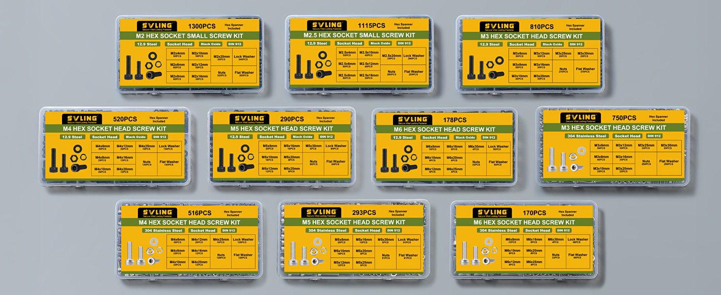 750PCS Hex Socket Head M3 Screw Kit:SVLING M3 screw kit includes 8 standardized metric lengths: 50pcs M3x6mm, 40pcs M3x8mm, 35pcs M3x10mm, 30pcs M3x12mm, 30pcs M3x16mm, 20pcs M3x20mm, 20pcs M3x25mm, 20pcs M3x30mm, matched with 250pcs hex nuts and 250pcs flat washers. Ideal for daily installation and repair