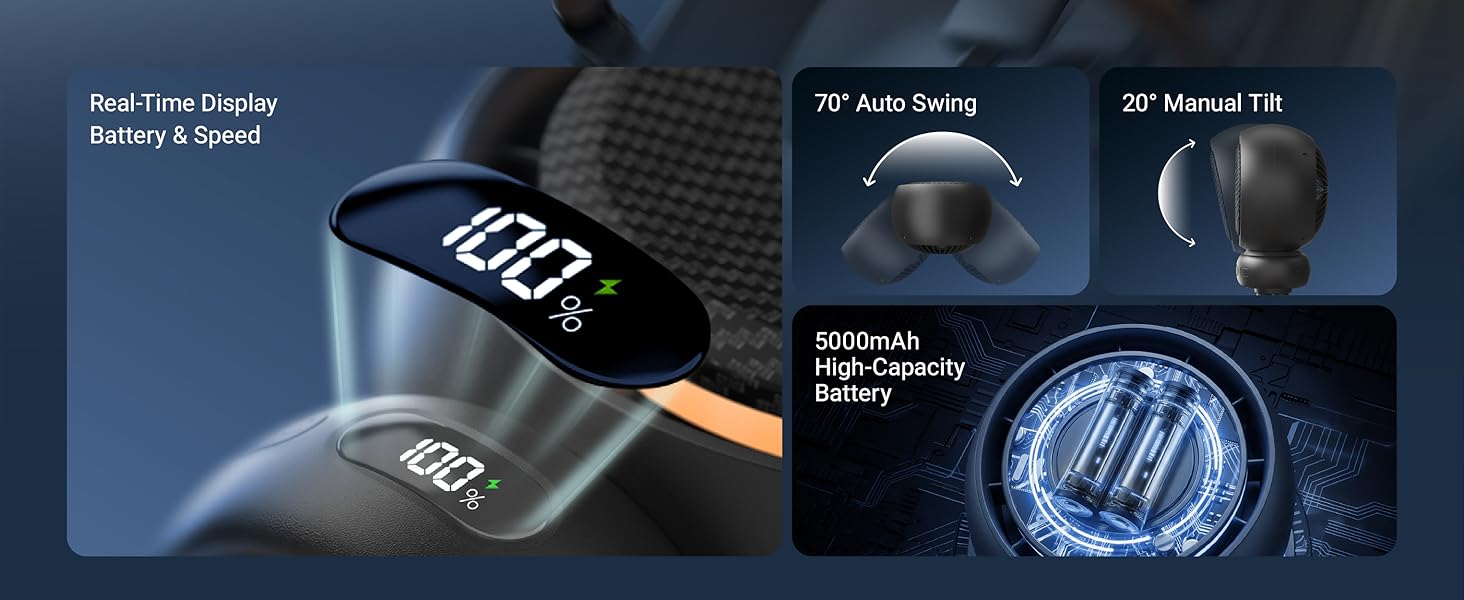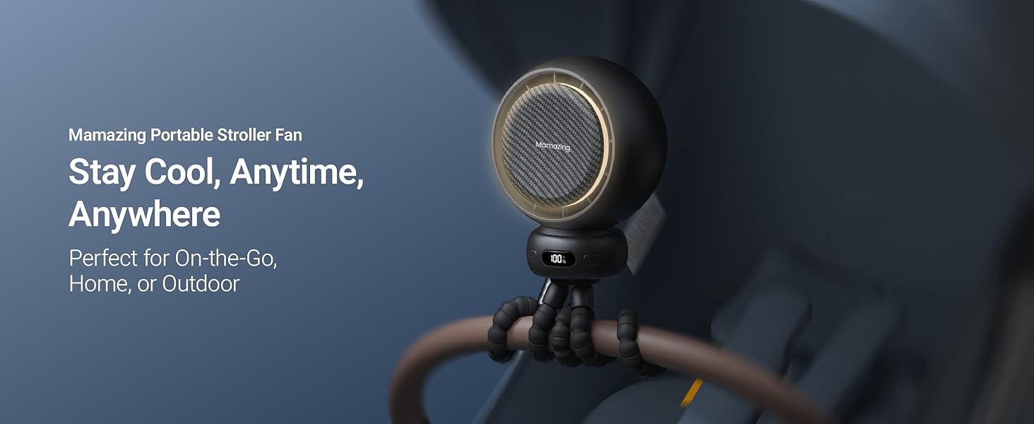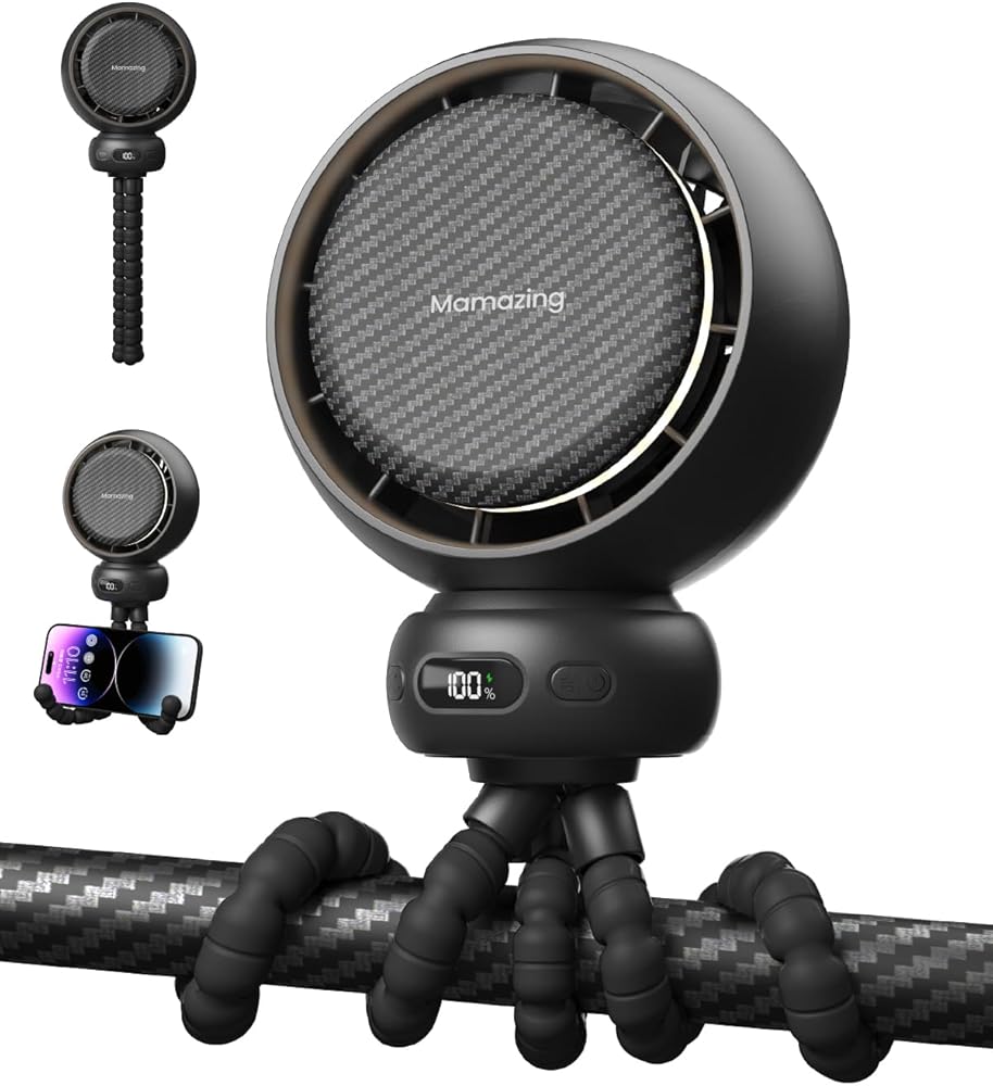 MAMAZING Mini Portable Stroller Fan, LED Display, 70° Auto-Oscillating Clip on Fan, 5 Speed Circulating Mode Included, Music & Night Light, 5000mAh USB-C Rechargeable Fan for Travel, Stroller, Car
