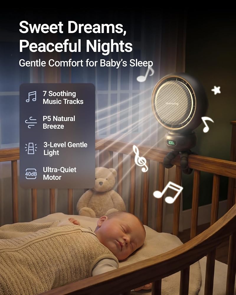 SLEEP SOUNDLY ALL NIGHT: This personal fan features gentle music, a soft circulating breeze (P5), and a 3-level night light—perfect for cozy sleep at home or helping baby rest during travel or camping