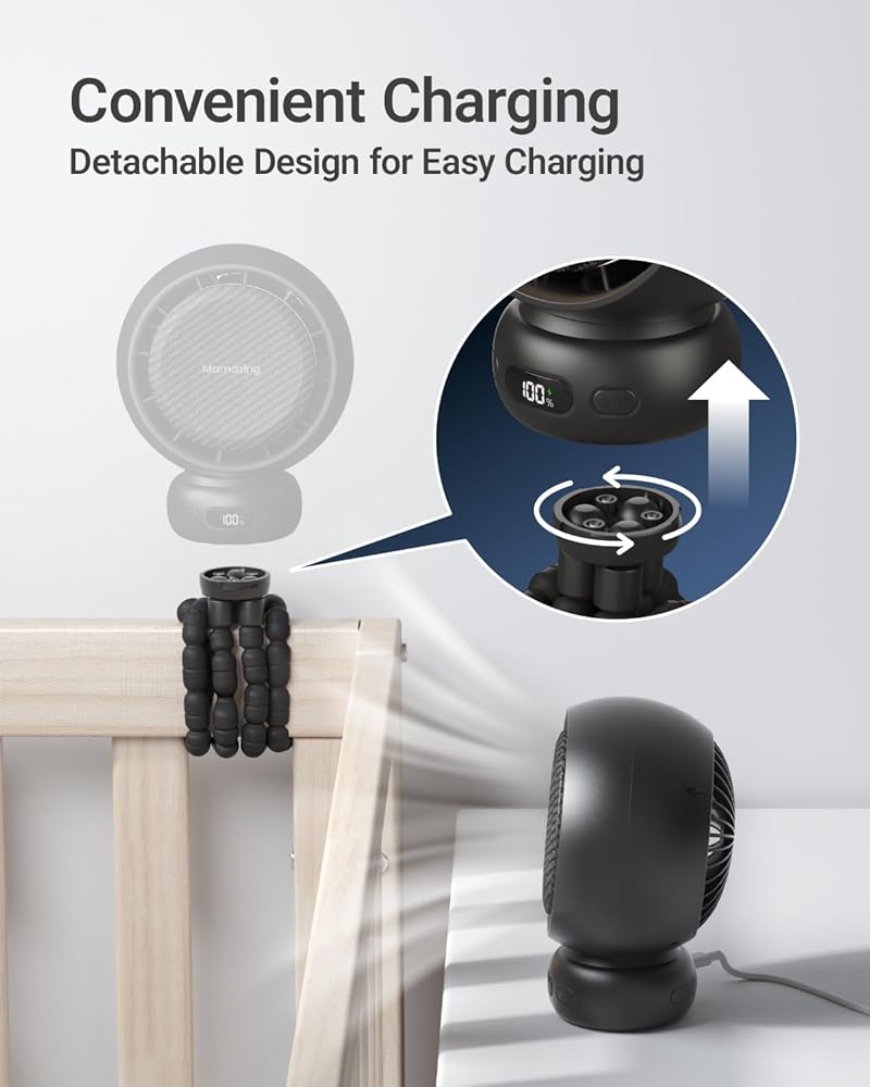 MULTIFUNCTIONAL AND PORTABLE: This clip on fan features a flexible, detachable tripod to attach anywhere—strollers, cribs, desks, or cars. Great for travel, kitchen use, gardening, or pet care