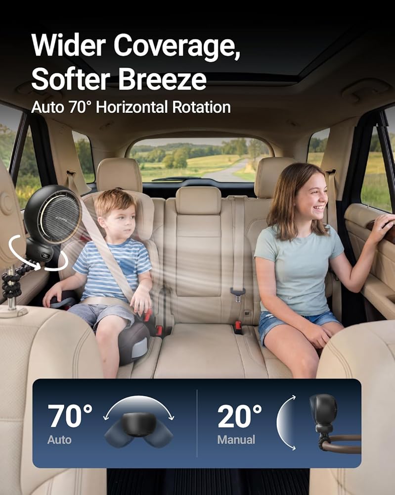 70° Auto-Oscillating: This small stroller fan swings 70° to spread airflow evenly, creating a soft, indirect breeze—ideal for walks, outdoor picnics, beach days, or staying cool at summer events