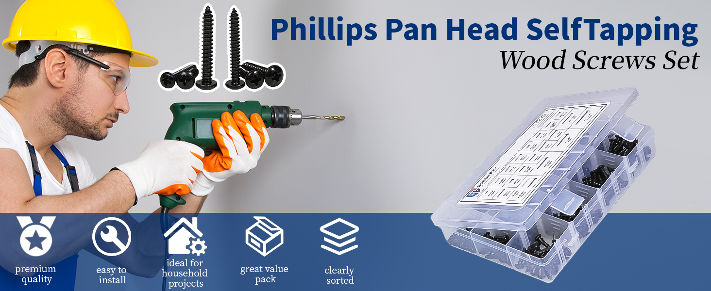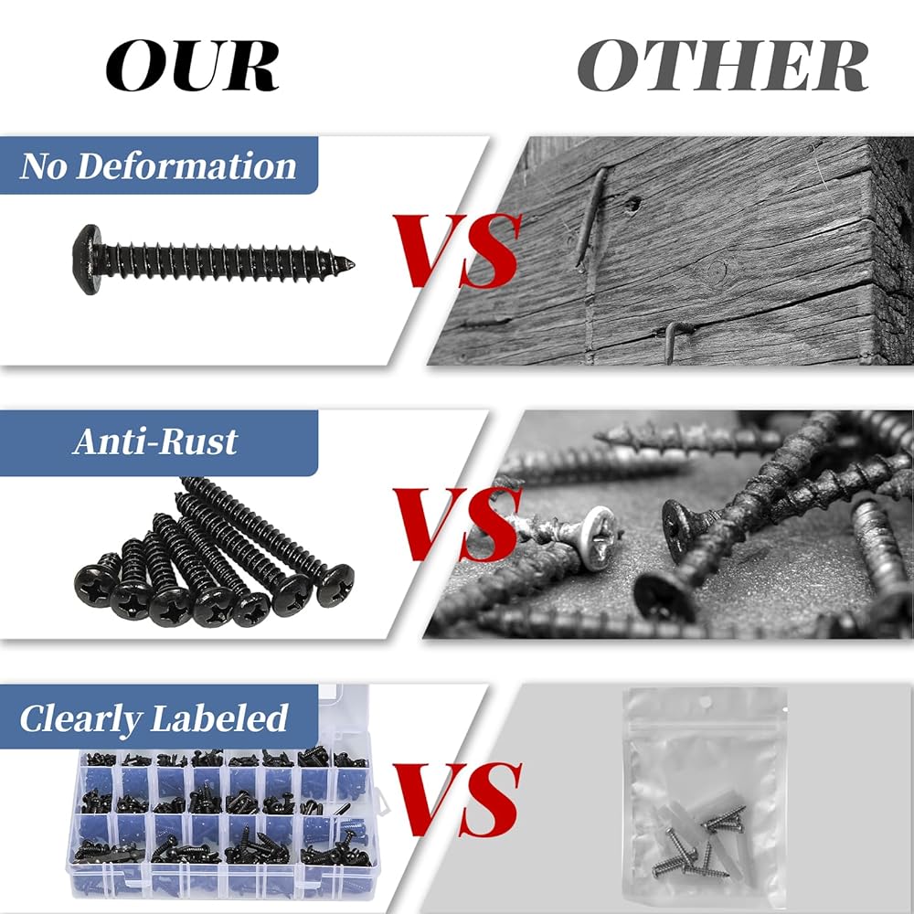 Various Size: A portative kit includes 8 sizes(1/4 in,3/8 in,1/2 in, 5/8 in,3/4 in, 1 inch, 1-1/4 in, 1-1/2in) of wood screws, 450 phillips screws are proper for your diverse projects.