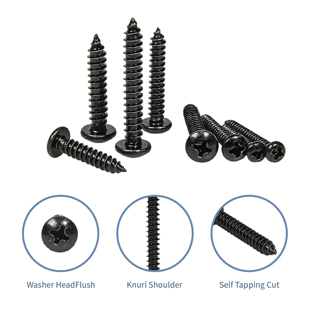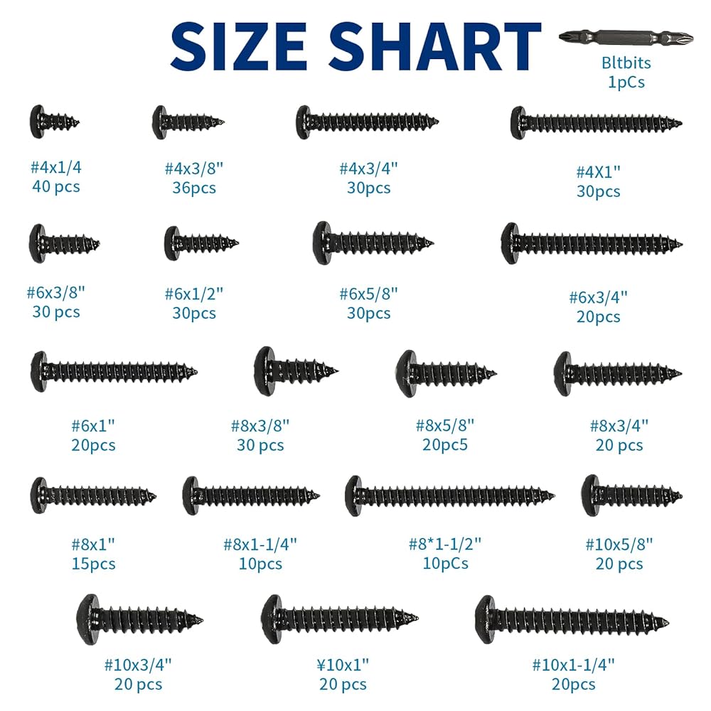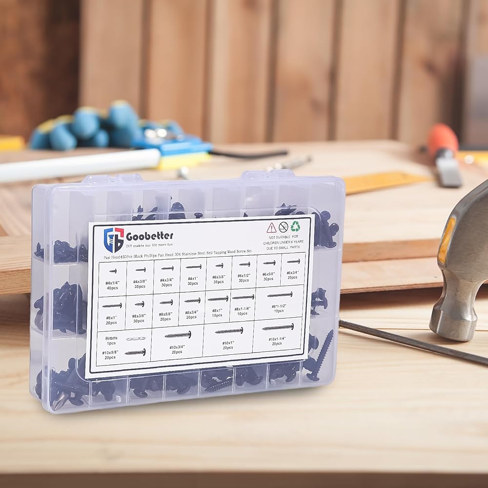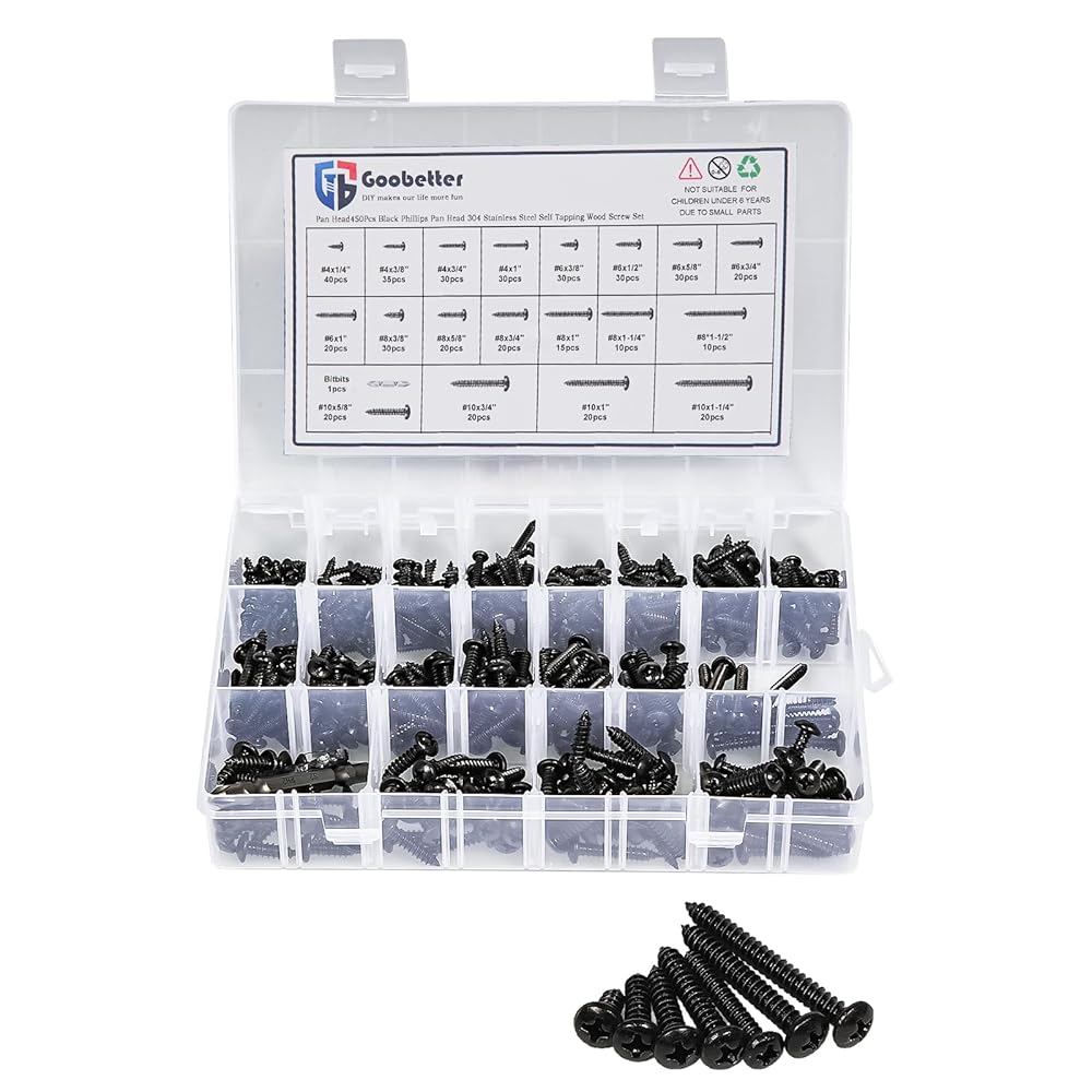 304 Stainless Steel Screws Assortment Kit, 450 pcs,Black Phillips Pan Head Self-Tapping Screws, Assorted Screws, Black Screw Set(#4#6#8#10#) Drive Bit Included Wood