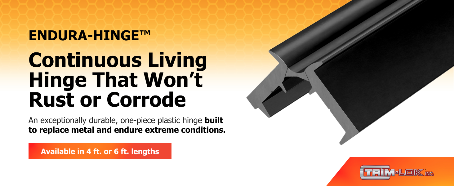 DURABLE CONTINUOUS PIANO HINGE: Endura-Hinge is a heavy-duty living hinge made from high-performance PVC that won't rust, corrode, or wear out providing unmatched reliability in outdoor applications and indoor applications alike