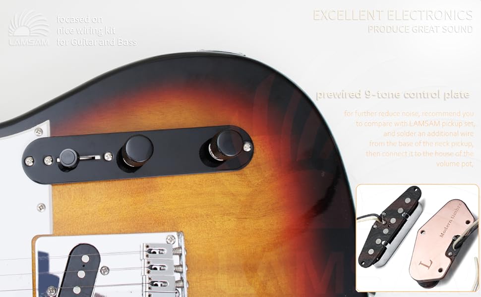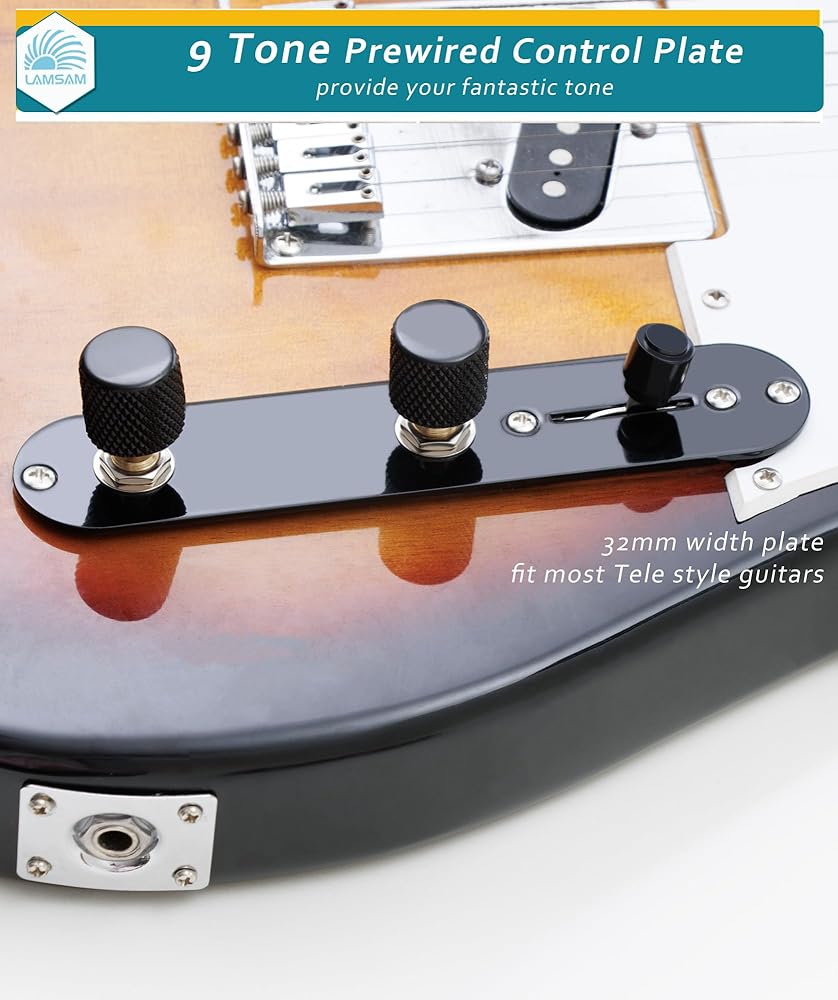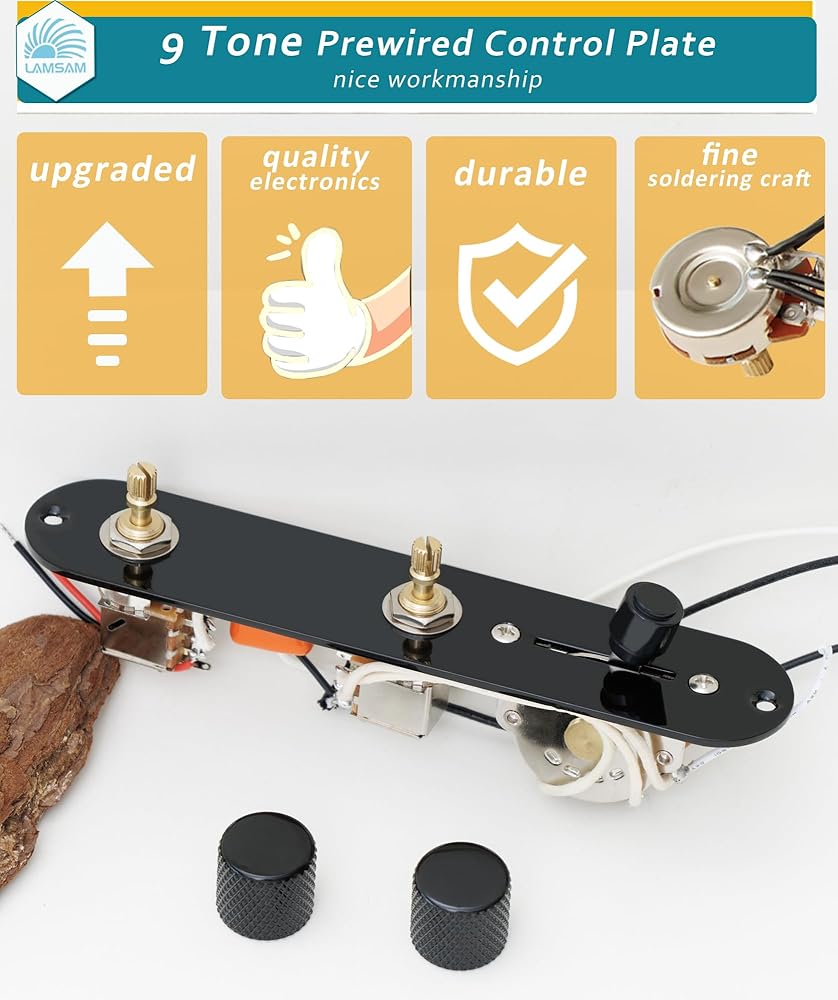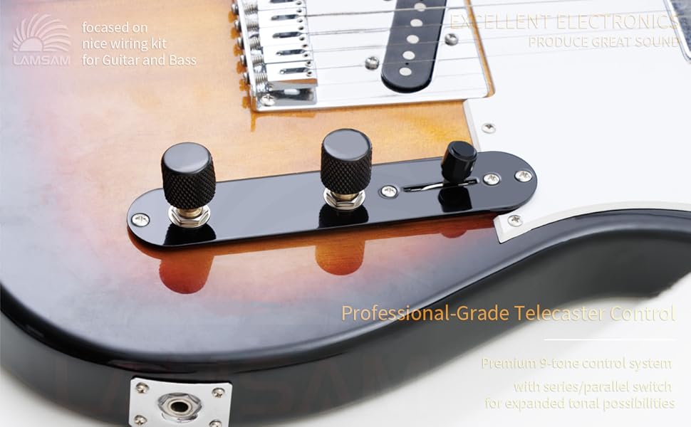 𝙒𝙝𝙖𝙩'𝙨 𝙄𝙣𝙘𝙡𝙪𝙙𝙚𝙙 - 1 × Prewired Telecaster control plate (9‑tone system with Series/parallel switching),𝙩𝙝𝙚 𝙥𝙧𝙚-𝙨𝙤𝙡𝙙𝙚𝙧𝙚𝙙 𝙘𝙤𝙢𝙥𝙤𝙣𝙚𝙣𝙩𝙨 𝙞𝙣𝙘𝙡𝙪𝙙𝙚𝙙: 473 orange capacitor, 3-way blade pickup switch, 250k push pull, high-quality push-back cloth cables; 2 × Mounting screws; 1 × Wiring diagram; 1 x 1/4inch mono output jack; 2 x knurled metal control knobs, 1 x switch tip in black