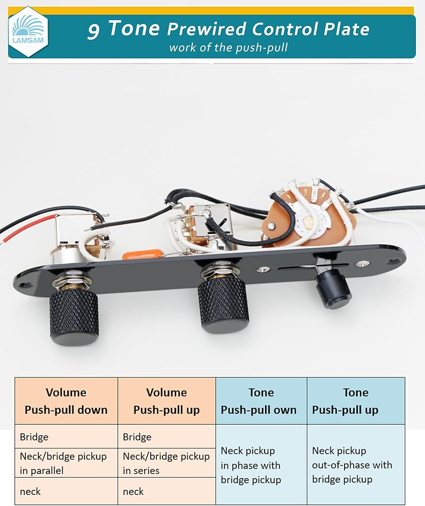 𝙃𝙤𝙬 𝙩𝙝𝙚 𝘾𝙤𝙣𝙩𝙧𝙤𝙡 𝙋𝙡𝙖𝙩𝙚 𝙒𝙤𝙧𝙠𝙨 - 𝙫𝙤𝙡𝙪𝙢𝙚 𝙋𝙪𝙨𝙝‑𝙋𝙪𝙡𝙡 𝙙𝙤𝙬𝙣: Standard Tele Operation, Position 1: Bridge pickup only, Position 2: Bridge/Neck pickups in parallel, Position 3: Neck pickup only 𝙫𝙤𝙡𝙪𝙢𝙚 𝙋𝙪𝙨𝙝/𝙋𝙪𝙡𝙡 𝙐𝙥: position 1: bridge pickup only, position 2: neck/bridge pickup in series, position 3: neck pickup work 𝙩𝙤𝙣𝙚 𝙥𝙪𝙨𝙝/𝙥𝙪𝙡𝙡 𝙙𝙤𝙬𝙣: neck pickup in phase with bridge pickup; 𝙩𝙤𝙣𝙚 𝙥𝙪𝙨𝙝-𝙥𝙪𝙡𝙡 𝙪𝙥: neck pickup out-of-phase with bridge pickup
