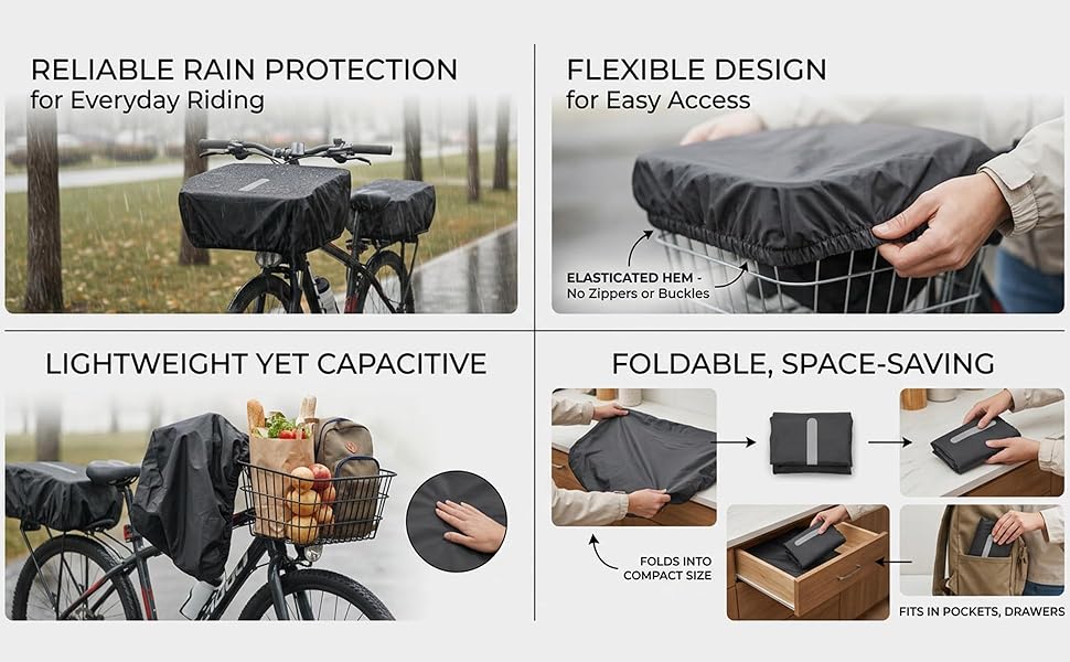 The flexible, lightweight design makes it easy to carry along and use when weather changes, helping keep basket contents covered during commuting, shopping trips, or short rides. Easy to put on and remove, it's a practical cycling accessory for daily use in unpredictable conditions.