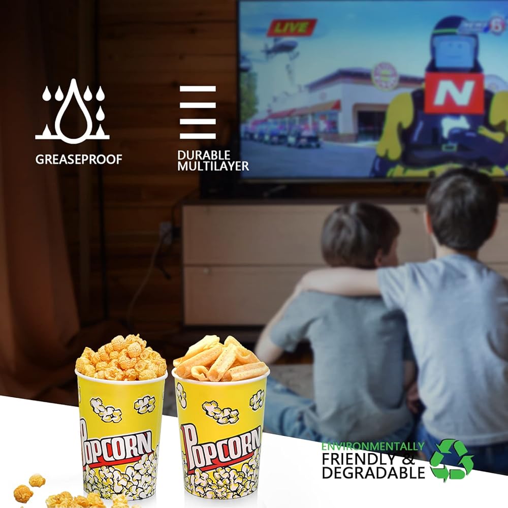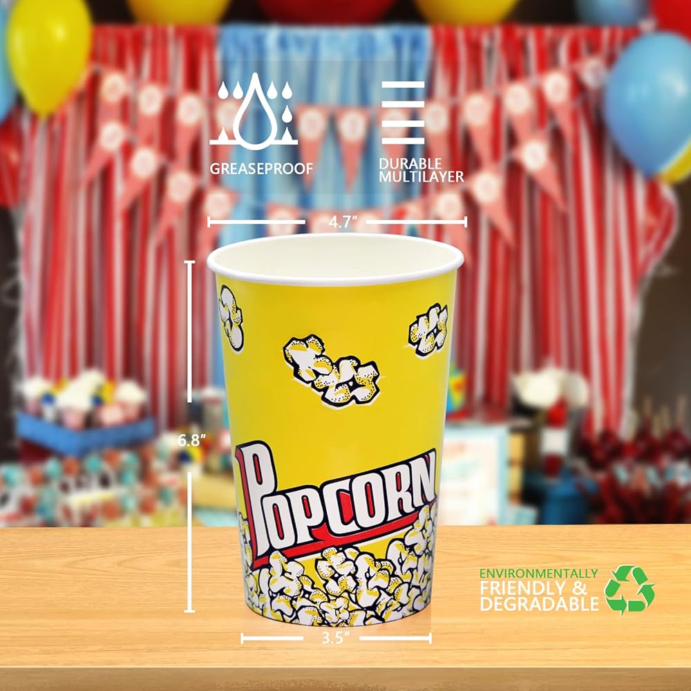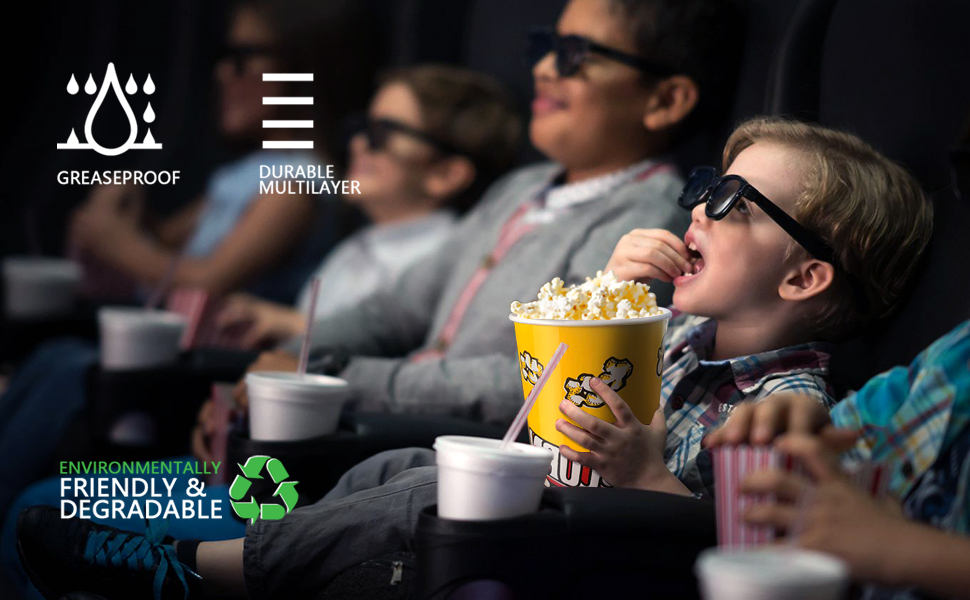 DISPOSABLE GREASE PROOF CONTAINERS: Made of premium quality paperboard material, our durable paper popcorn cups are grease-resistant. You'll never have to worry about butter or grease leaking through the bucket and getting onto your clothes