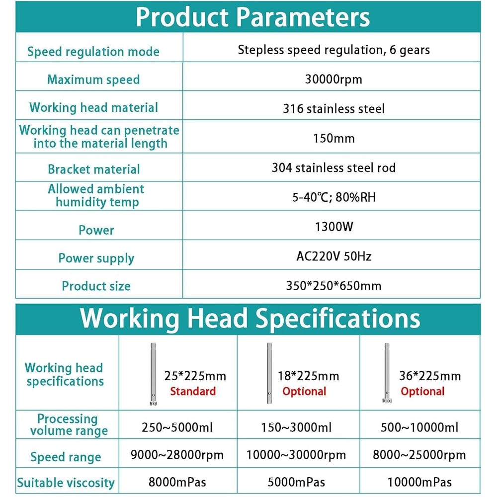 • Removable Working Heads】The working heads of the homogenizer is made of 316 stainless steel, which is high-strength and corrosion-resistant. It adopts an internal suction structure, and the effects of dispersion, average emulsification, etc. are outstanding.