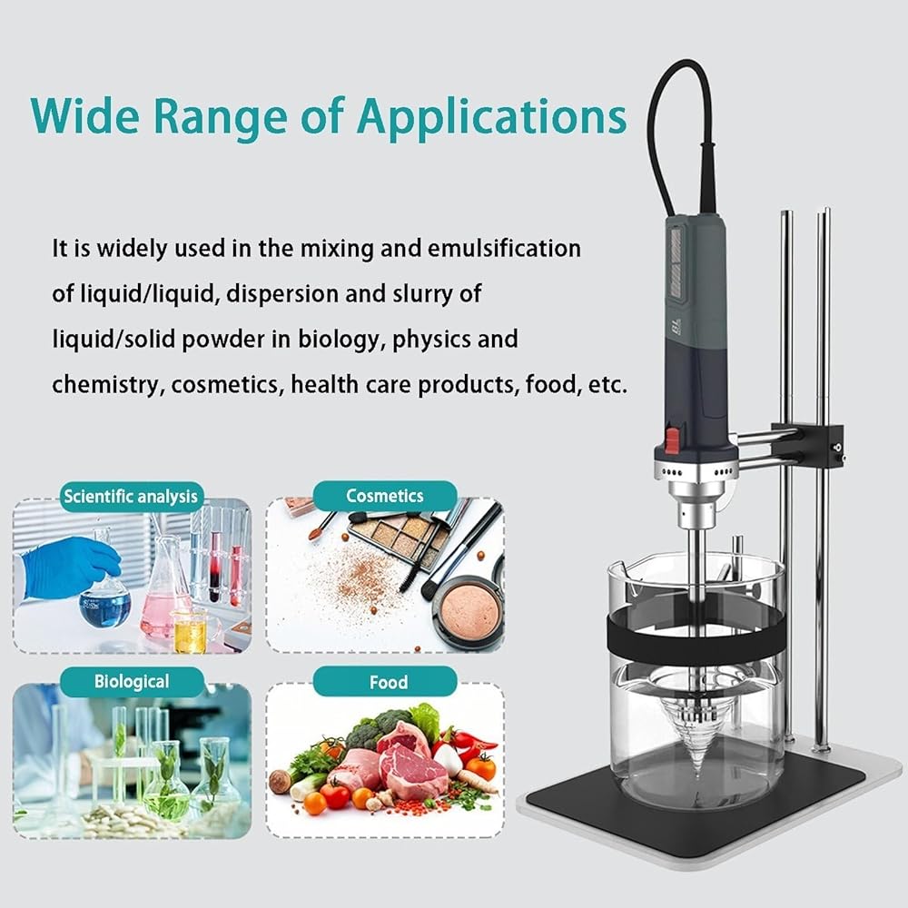 • Wide Range of Applications】This homogenizer is widely used in biology, physics and chemistry, cosmetics, health products, food and other liquid/liquid mixing, emulsification, liquid/solid powder dispersion, slurry.