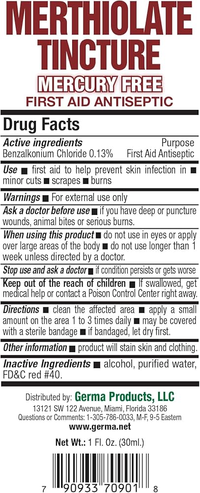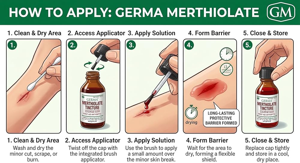 TRADITIONAL FIRST AID STAPLE: A beloved favorite in Hispanic heritage (Boticas) for generations; Germa brings the authentic Merthiolate experience to your modern medicine cabinet.