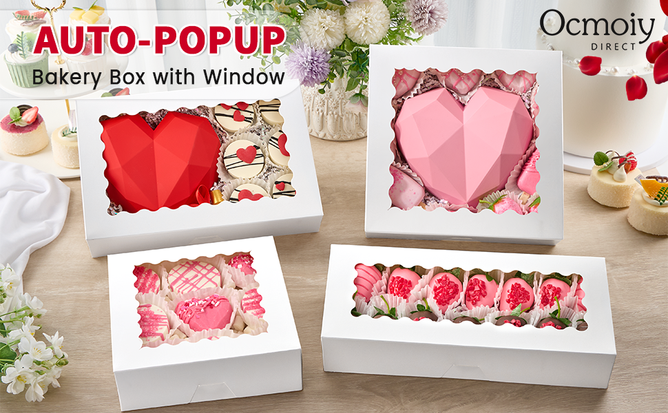 Auto-Popup Bakery Box: Package includes 20pcs 10 x 10 x 2.5 inches white cookie boxes with windows and 24pcs "Thank you" stickers, these boxes are perfect for packing cookies, chocolate strawberries, pastries, muffins, donuts and more