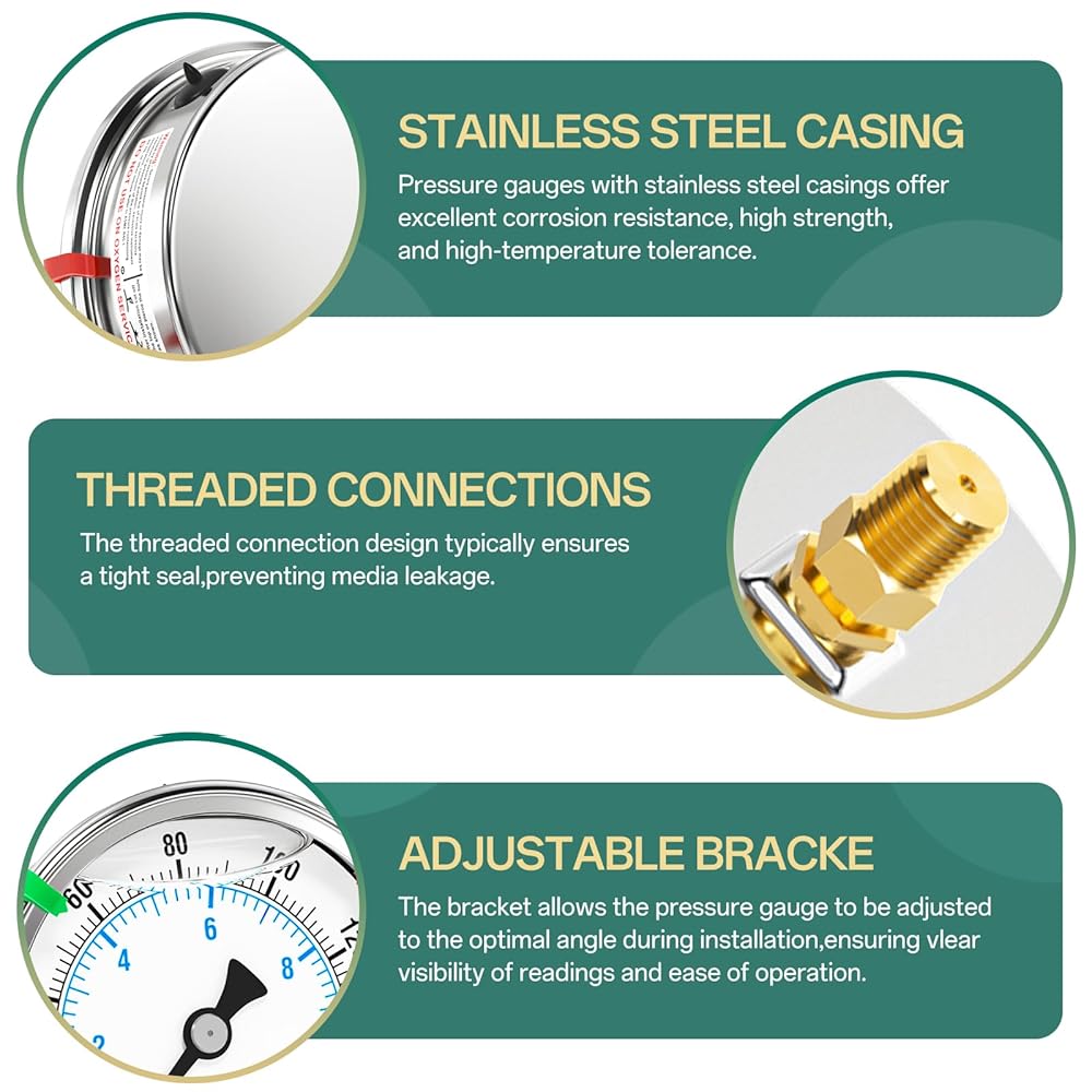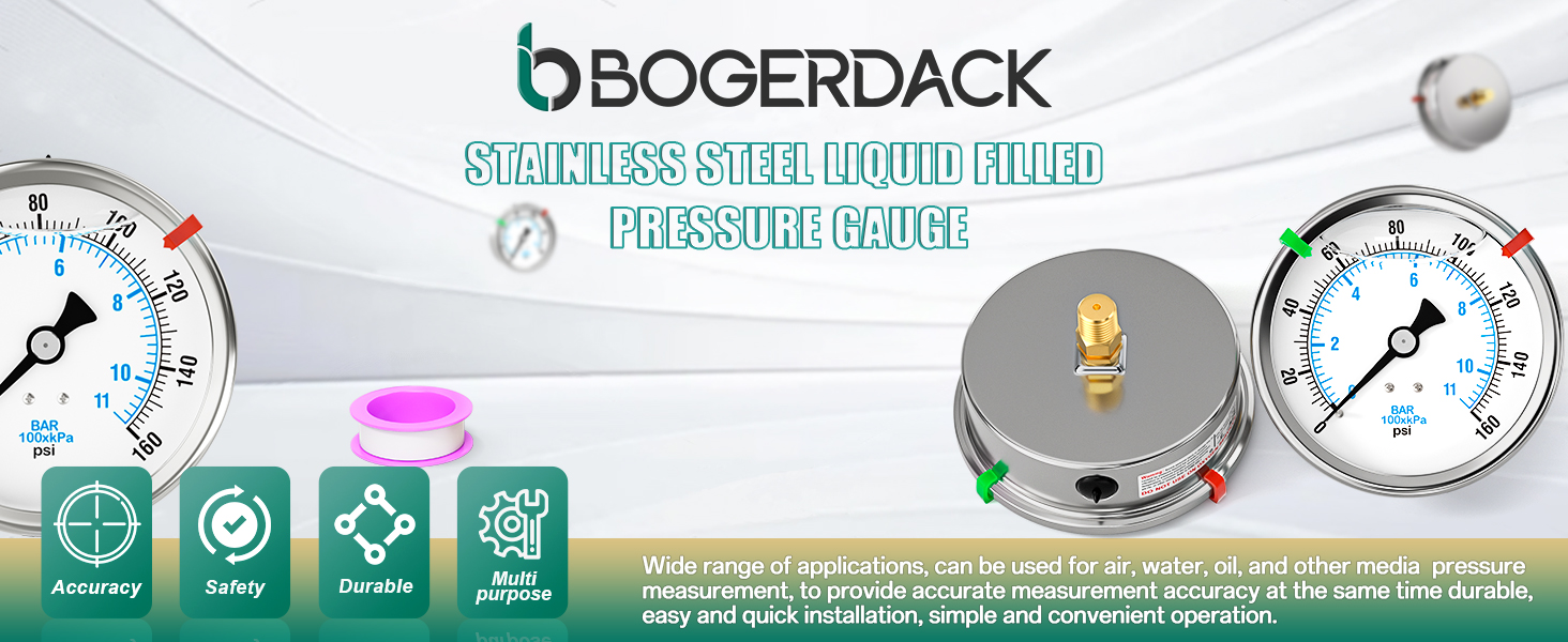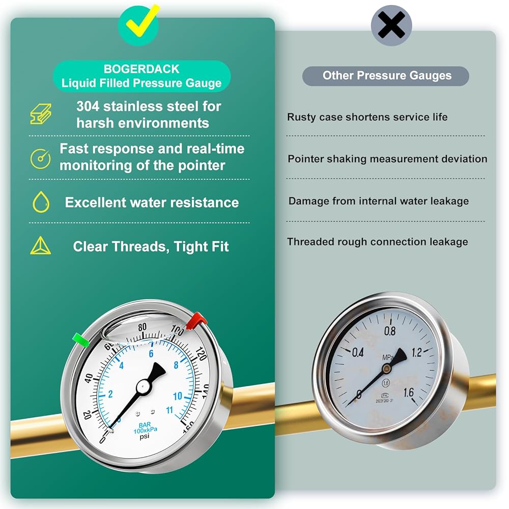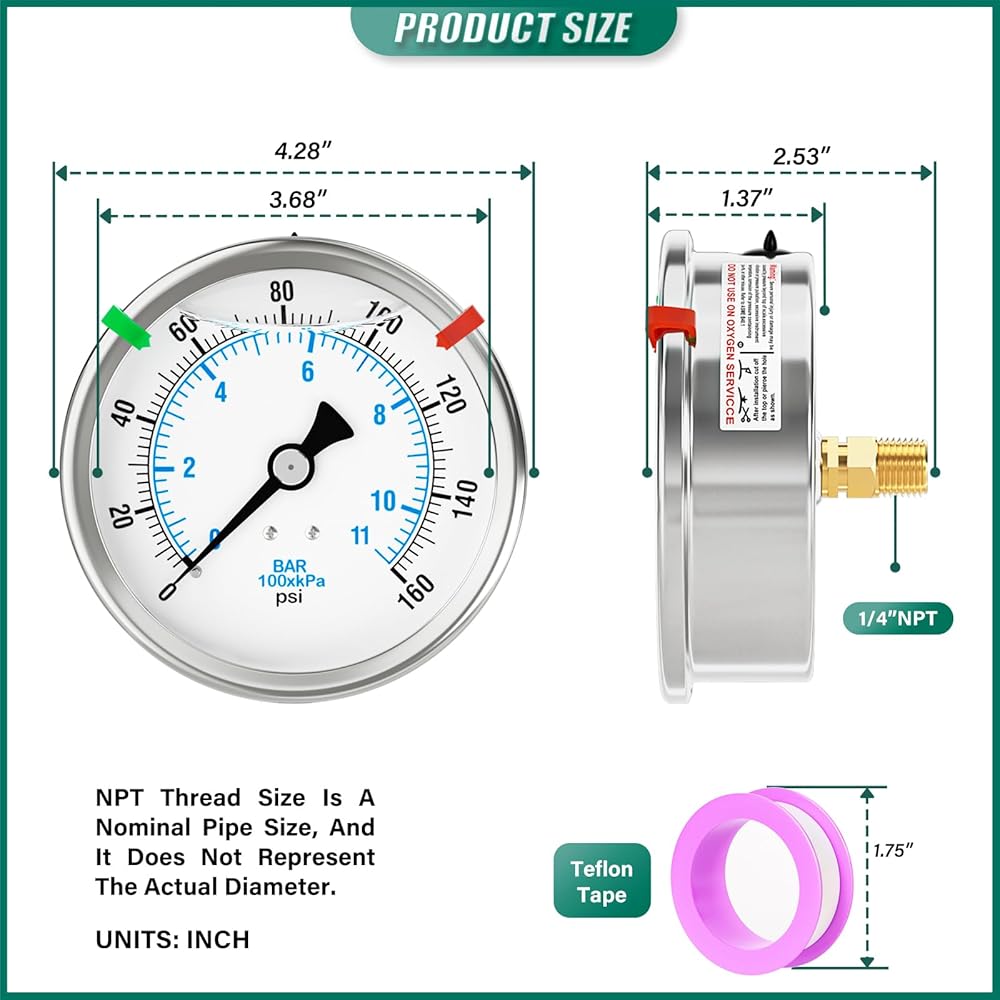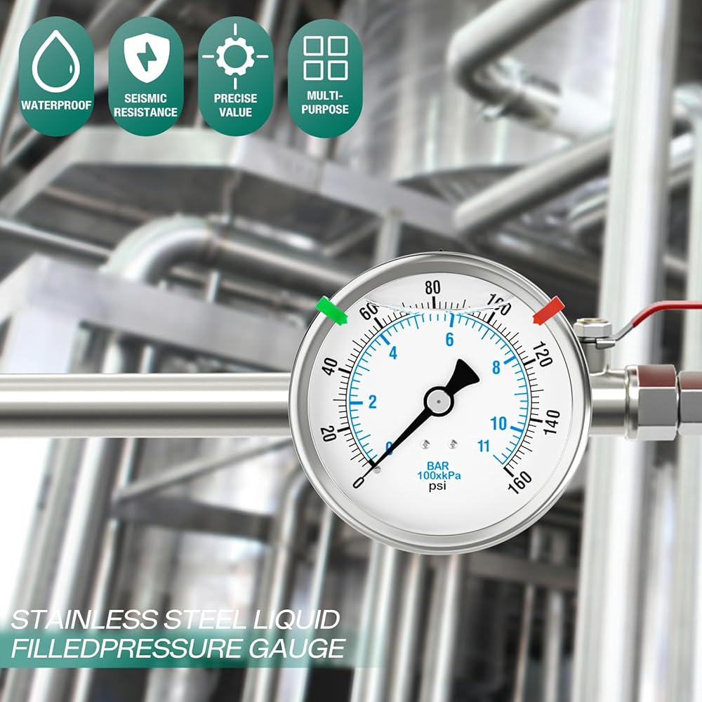 0-160PSI Stainless Steel Liquid Filled Pressure Gauge, 4" Dial Size, 1/4" NPT Back Mount, for Tube, Water Pump, Gas, Liquid, Pressure Test (with Range Mark Pointer)
