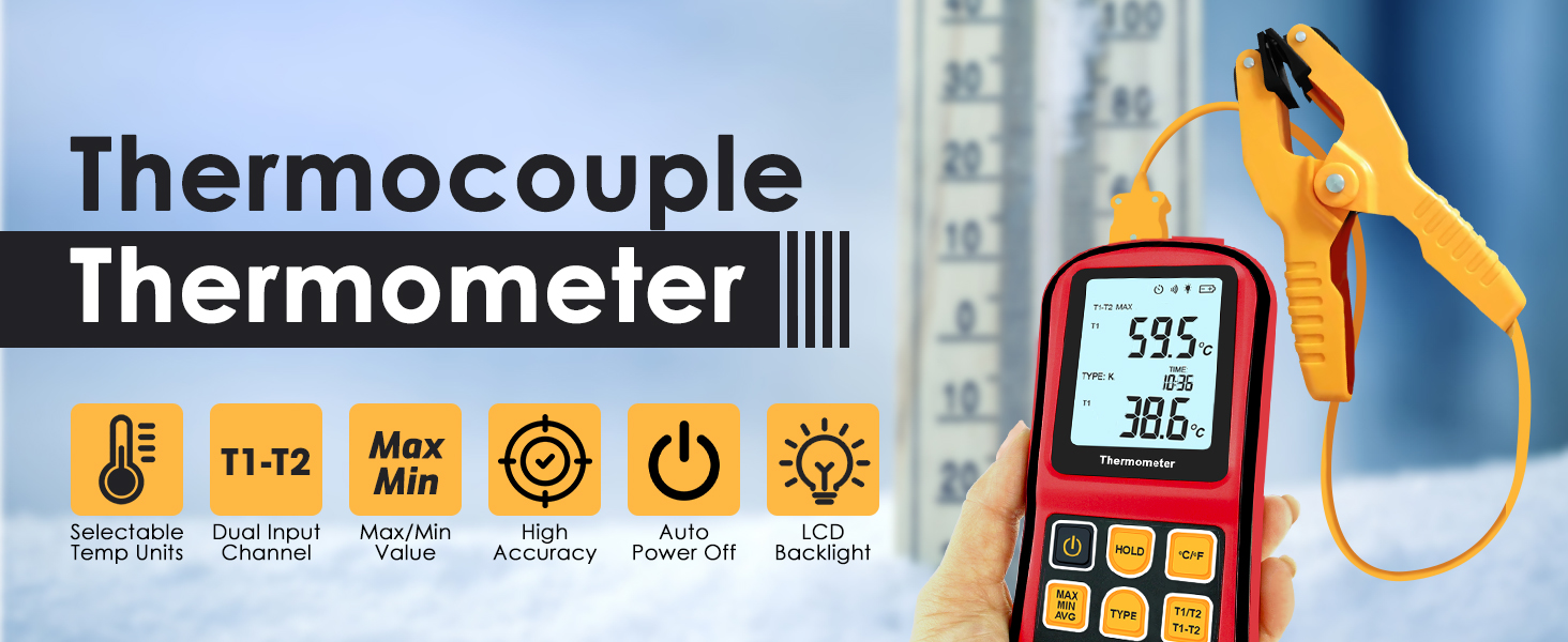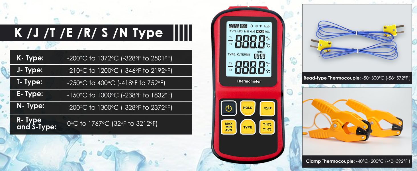 【MUTI TYPE THERMOCOUPLE】Thermocouple thermometer supports K/J/T/E/R/S/N type thermocouples. Use it as a versatile thermocouple reader, thermocouple tester, or HVAC thermometer with high accuracy
