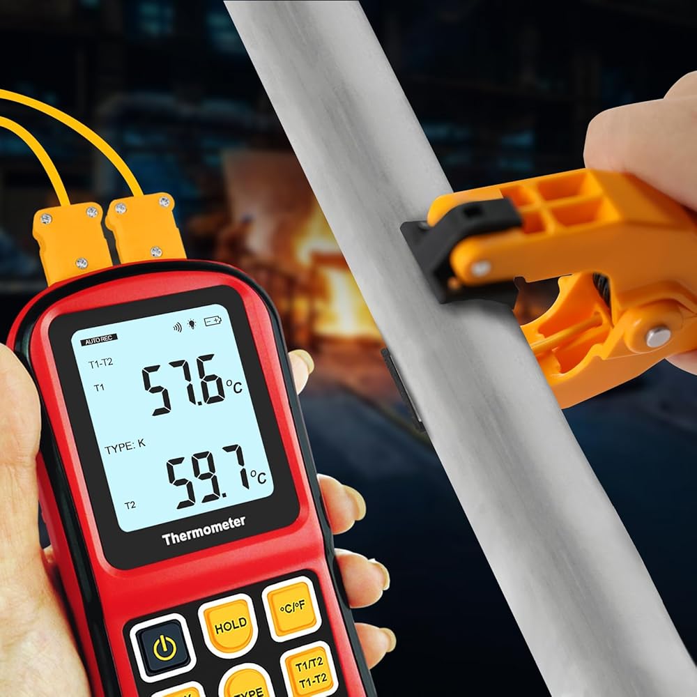 【WIDELY USED】Dual channel thermometer includes 2 wired K-type thermocouple probes and 2 temperature clamps. Use as an HVAC temperature meter, temp probe HVAC tool, or dual channel thermometer for liquids, air, engines, and molten materials