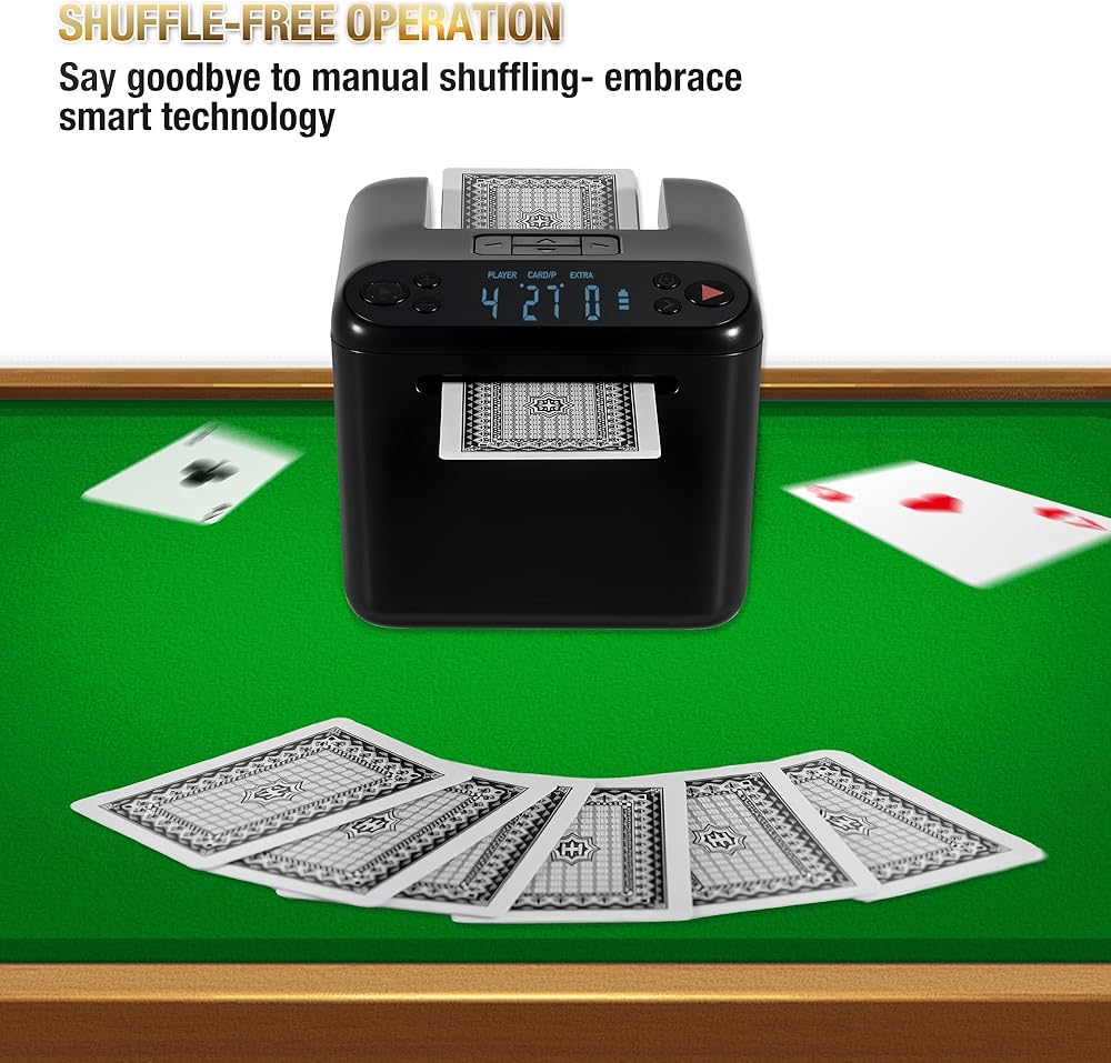 LED Display: The playing cards dealer features an unframed digital display, responsive buttons, and comes with a detailed instruction video, easy for anyone to start using the machine quickly, even if they're new to automatic card dealers