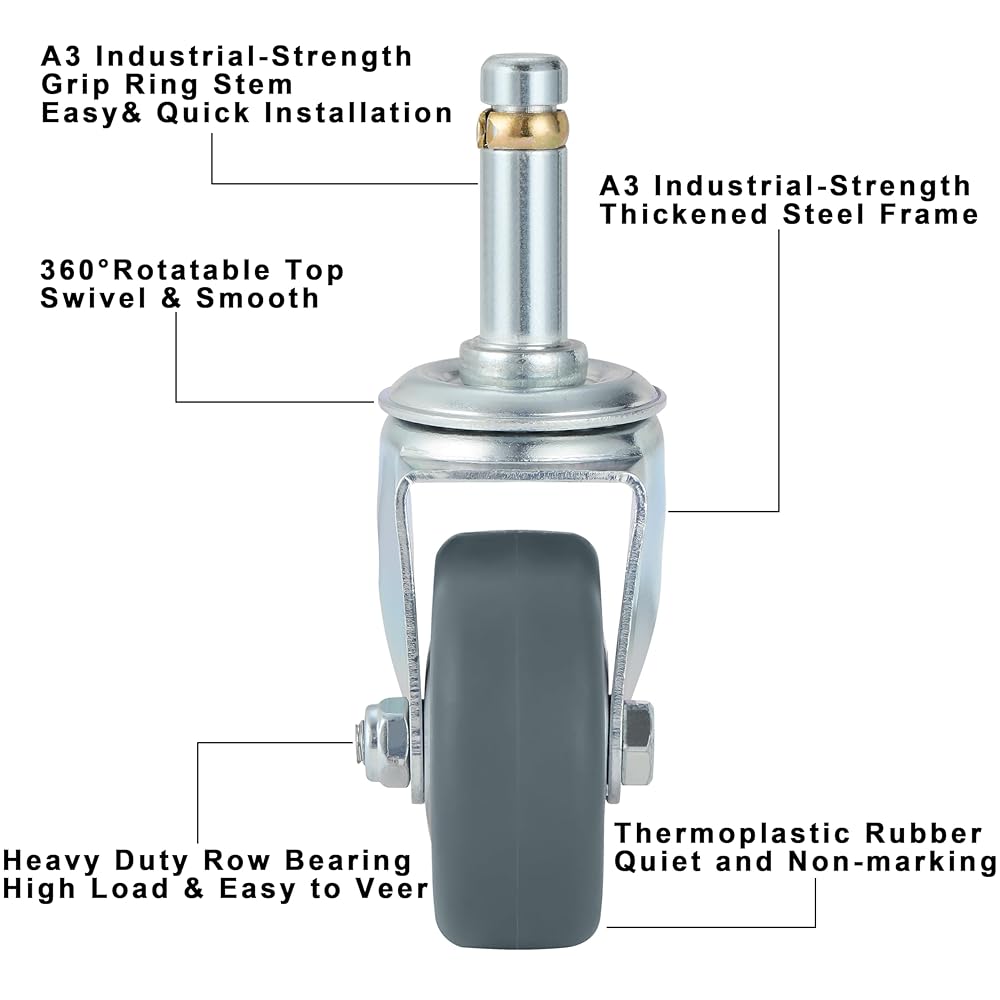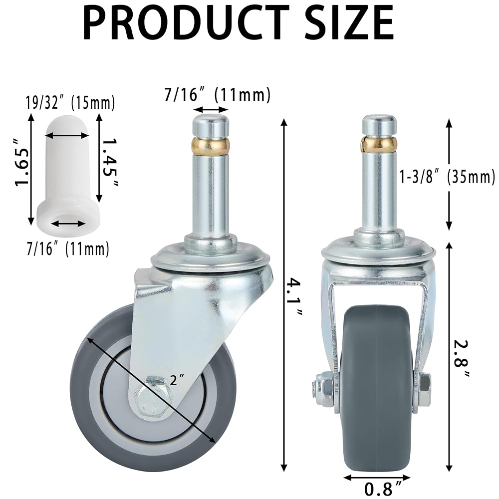 PACKAGE: Included 4 Swivel Stem Casters (7/16"x1-3/8"), 4 Insert Sleeves.