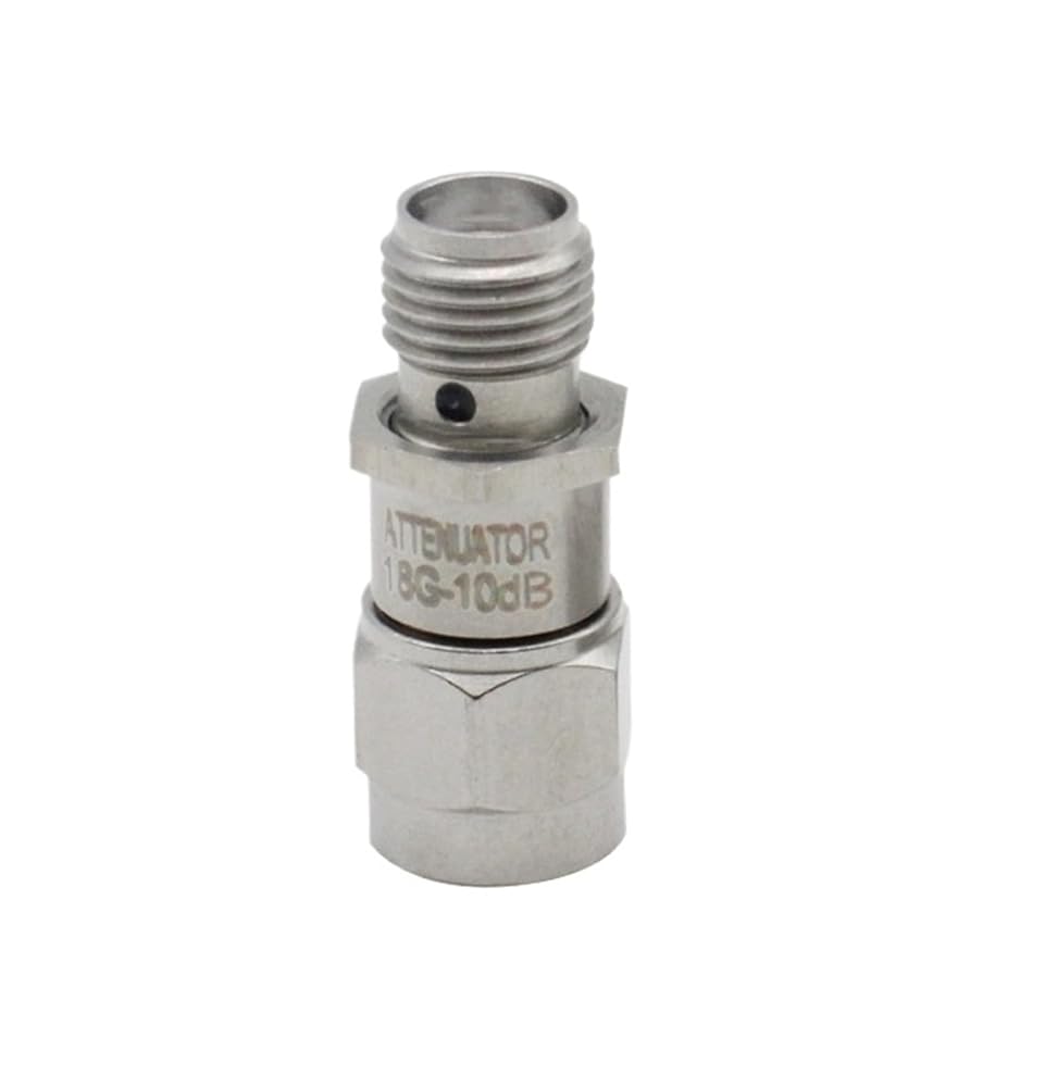 Radio Frequency Attenuators One coaxial fixed SMA attenuator, 18GHz high frequency, 2W, SMA-JK male and female connectors, attenuation range 2dB, 3dB, 5dB, 6dB, 10dB, 15dB, 20dB, 30dB.