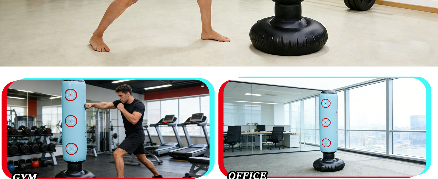 【Easy to Inflate and Portable】This inflatable punching pillar comes with a 4-inch inflatable foot pump.With 1 water inlet and 3 air inlets for the base, neck, and body sections, inflating and deflating this punching bag is a breeze. It can be folded into a compact size for convenient storage, making it ideal for use at home, in the office, or outdoors.