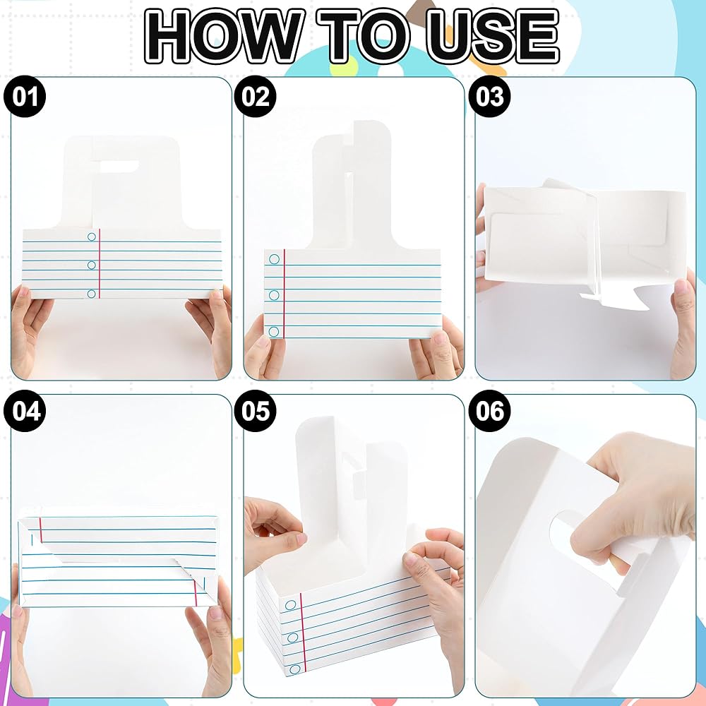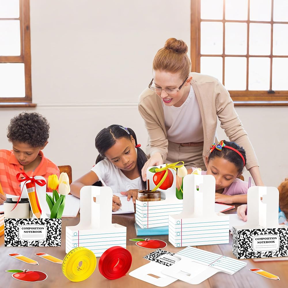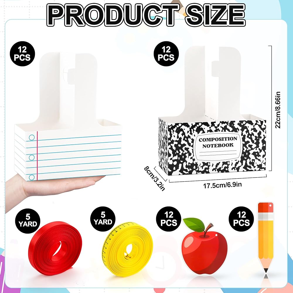 This teacher appreciation gifts cup drink carrier set offers a practical and thoughtful way to prepare classroom thank you gifts. With two composition notebook style designs, it works well for coffee caddy use, teacher gift bulk preparation, and back to school appreciation or party favors. 24 cup drink carriers total 12 black white composition notebook style 12 blue white composition notebook style 24 writable hanging greeting cards 2 ribbon roll 5 yards Made from sturdy paper material, the disposable cup holders provide reliable support for hot or cold drinks while maintaining a clean classroom appearance. Size ca. 7.1 x 8.9 x 3.1 inches Weight ca. 0.93 lb Material paper Fold along pre scored lines before use and add drinks notes or small gifts to create easy to carry teacher appreciation gifts for school events.