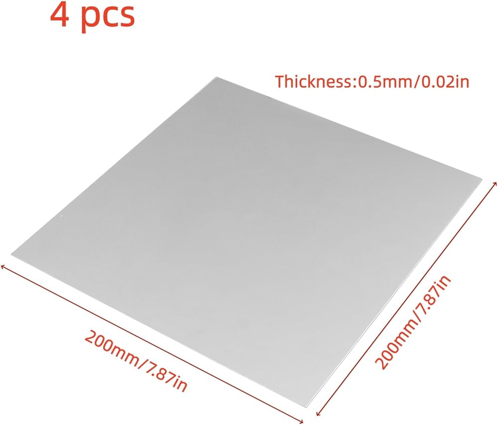 Package includes: 4 Pcs aluminum sheets; Size: The length of this sheet metal is 200mm/7.87", Width is 200mm/7.87" and thickness is 0.5mm/0.02"