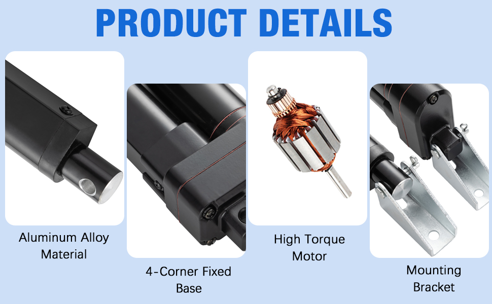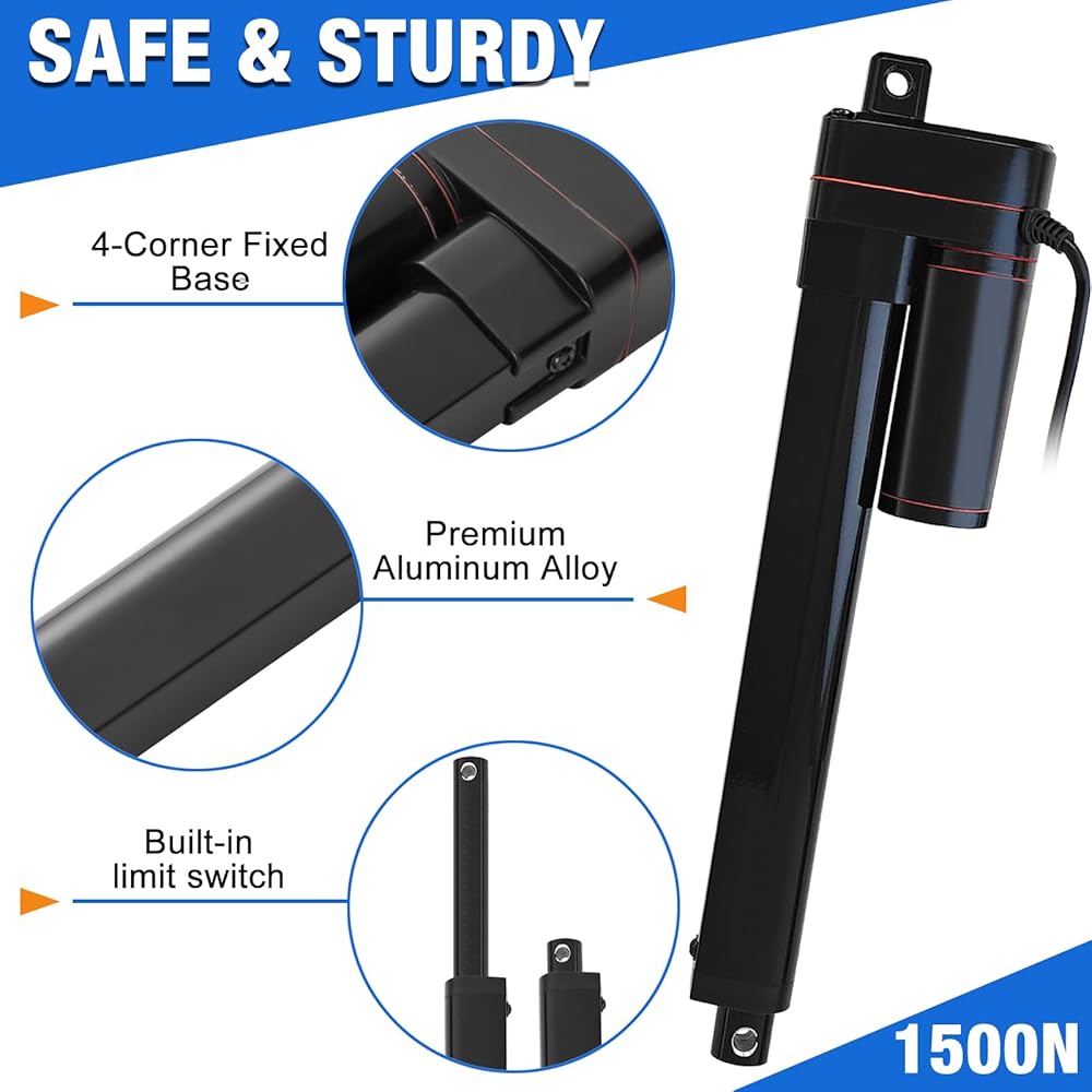 Safe & Sturdy:With self-locking function and built-in limit switch,it can be stopped at any position and automatically stop at the top and the bottom,providing reliable and safe operation;With high-quality aluminum alloy and four-corner fixation base design,make linear actuator have better stability and load-bearing capacity.