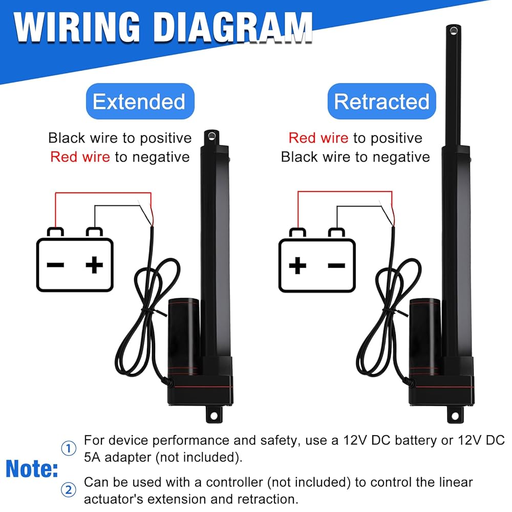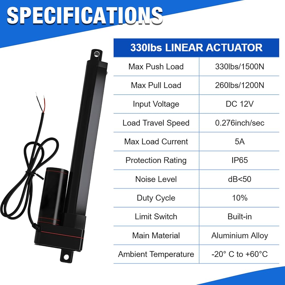 Specification:Voltage:DC 12V;Stroke length:8"(200mm),Fully retracted length: 13"(330mm), Fully extended length:21"(530mm);No load speed: 0.394"/sec (10mm/s), Maximum load:330lbs(1500N);Maximum current draw:5A.